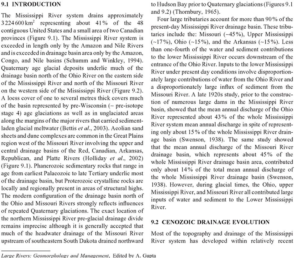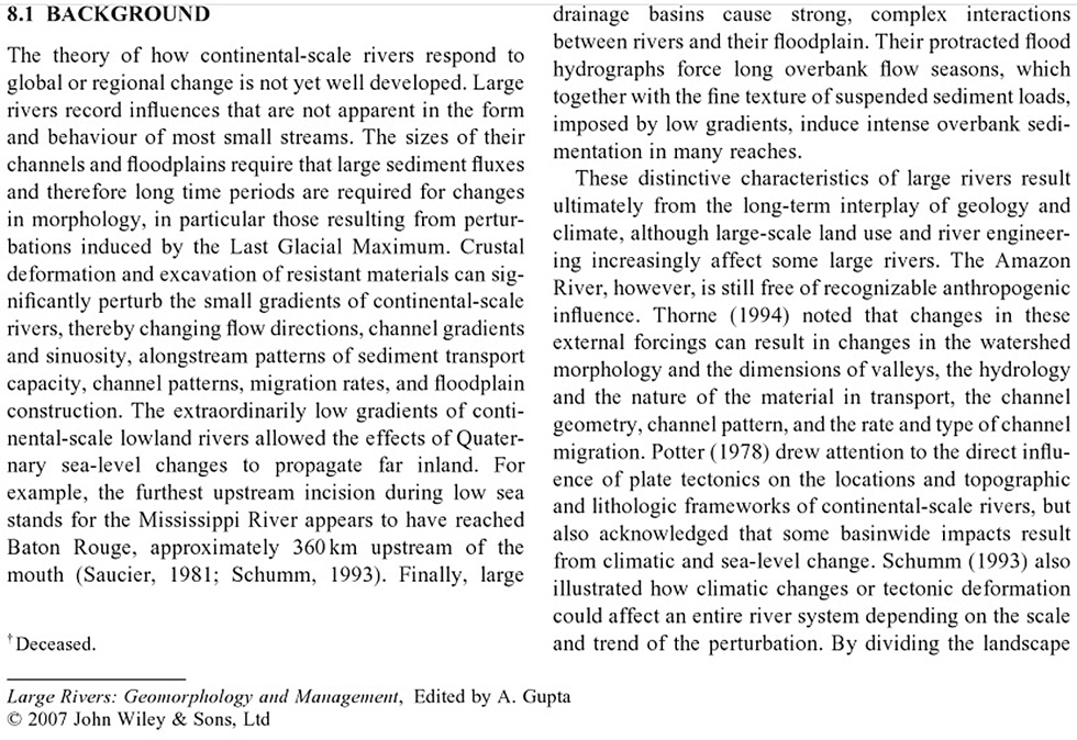 Large Rivers El vínculo que sigue refiere del hermoso libro Large rivers: geomorphology and management Editado por Avijit Gupta y publicado por John Wiley en el 2007 Unas pocas páginas que copio al final de esta presentación del índice de la obra, nos ofrece Google para acercar aprecios. En todos los casos está ausente la energía del sol y su medular intervención en las dinámicas de estos cuerpos de agua, que para no alterar los climas académicos siguen disfrutando de mecanicismos apoyados en energía gravitacional.