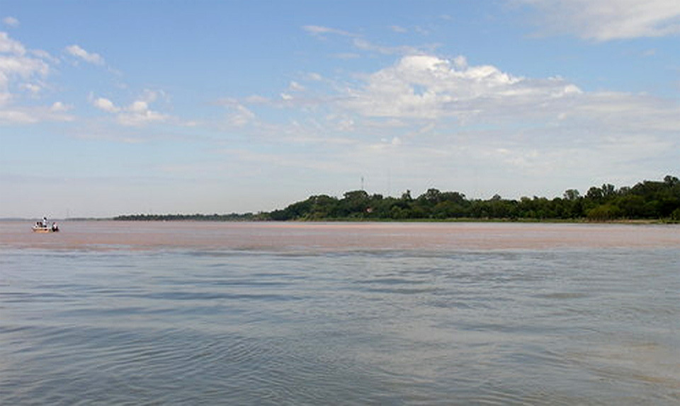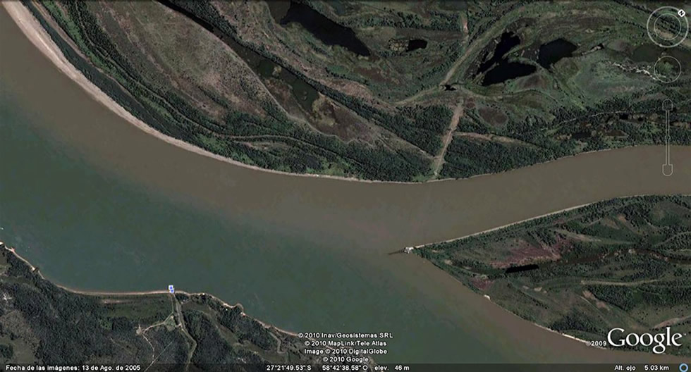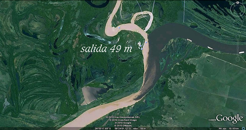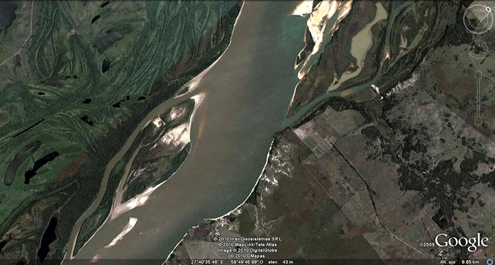 Altísimo contraste aún en el plano superficial descubren en Paso de la Patria esos corredores tan apareados, como disociados . Siguen imágenes del Paraná a la altura de la ciudad de Corrientes diferenciando las identidades de las aguas de ambos cursos, que cientos de kilómetros después de su mecánica juntura siguen reconociendo disociación térmica e hidroquímica y por ende, diferencias de rendimiento convectivo.