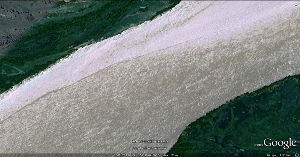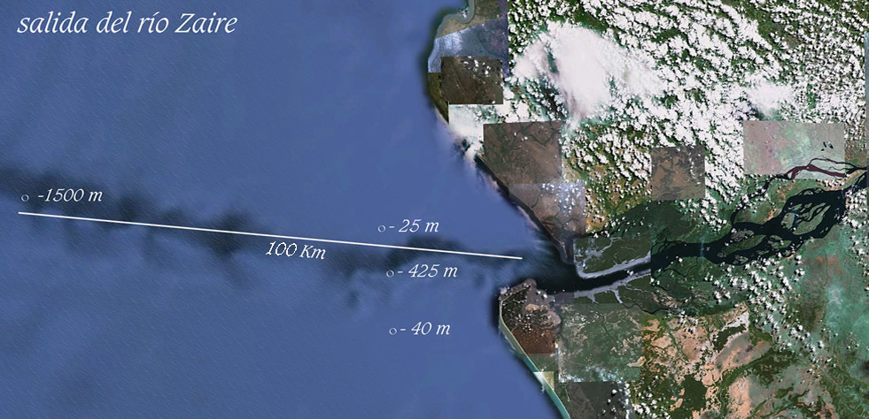 Sigue imagen del río Uruguay con las aguas del Negro bien disociadas, incluso en velocidad. . . . . . . Sean estos ejemplos rescatados de nuestras observaciones locales aplicables a entender las implicancias que tienen los sedimentos en las aguas para asistir la captura de las energías solares que habilitan su convectivo andar y sin abandonar la carga en el camino. Comencemos a olvidar la fabulada energía que en cajas negras imaginan energía gravitacional y dejemos de lado en planicies extremas otro arrastre de fondo que no sea el prolijo limpiafondo que aportan los flujos convectivos. Meade reporta en 1977 en la ciudad de Obidos, a unos 800 kilómetros de la boca, el pasaje anual de 470 millones de toneladas de sedimentos, de los cuales un 75 por ciento alcanzan el Atlántico, para ver el 25 por ciento restante depositado en el tramo inferior del río. No sólo alcanzan el Atlántico, sino que hacen camino costanero en él, para 600 Km al Norte cruzar la plataforma continental y alcanzar a sumergir sus aguas dulces con pesada carga sedimentaria, más allá del borde del profundo talud continental. Veamos de un hermano africano, antecedentes millonarios en años. Una hipótesis científica señala la fuente del Amazonas original, 130 millones de años atrás, en el macizo del Ennedi en el noreste de la actual República de Chad; otros en el lago Tanganika, Africa; por entonces formando parte del súper continente Gondwana. En relativa coincidencia con la boca del actual río Zaire, el 2º más importante del planeta en caudal de descarga, pero con mediana carga sedimentaria relativa, ubicaría, de haber permanecido los continentes unidos, la actual boca del Amazonas arrimándome a esa tesis. El Zaire sale al Atlántico con tales energías: gravitacional y convectiva, que nada ni nadie le impide tallar en el fondo de la plataforma continental un surco que en 125 Km baja desde los 25 m hasta los 1872 m. Ya no se trata sólo de remontarnos a los tiempos de la gran regresión de la última glaciación máxima; sino de reflexionar sobre la forma de trazar ese surco y mantenerlo limpio a más de 1500 m de prfundidad. Sin duda en aquellos tiempos de fuertes erosiones la carga sedimentaria sería mayúscula y nada le impediría no sólo mantenerla disociada de las aguas saladas, sino también llevar su pesada carga al fondo del océano. El agua dulce es más liviana que la salada, en tanto no consideremos su carga de sedimentos; y amén de su peso, las aptitudes para capturar energía solar y así oficiar de batería convectiva y motor solar en un amplio menú de intercambios de energía. Hoy, el pulido perfil nos alcanza sospecha de que tal surco pudiera estar activo hospedando la energía del Zaire disociada del abrazo del mar y con suficiente carga sedimentaria como para bajar a esas profundidades con la gran energía que traduce su tarea y su caudal ¡Quién imaginaría el tallado de una sangría de 125 Km bajando 15 m x Km hasta más allá de los 1500 m de profundidad! Esto ya no es producto de una regresión marina, sino de un corredor de flujos tan especial que nunca al parecer lo hubimos de imaginar. Esta sangría tallada en el perfil del talud continental nos obliga a abrir los ojos para mirar por la identidad de esas aguas y las energías que cargan. Hoy, las mismas aguas dulces del Zaire con sus moderadas cargas sedimentarias parecen ser suficientes no sólo para sumergirse en medio de las aguas saladas, sino también para seguir como herramienta convectiva obrando la limpieza de esa sangría en el plano profundo del talud.