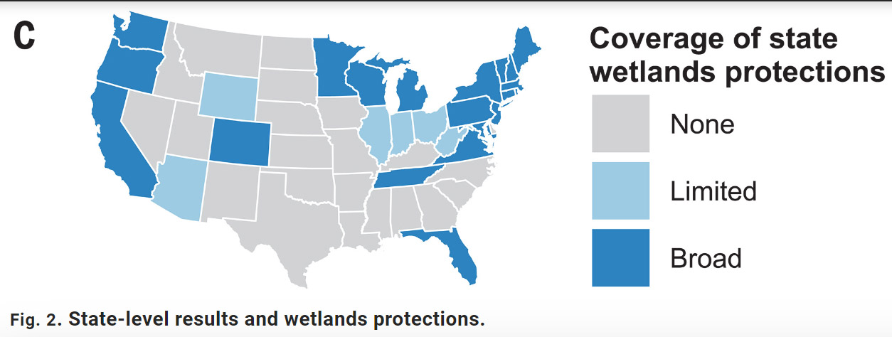 Conclusions This study estimates potential impacts of the Supreme Court’s ruling in Sackett v. EPA and highlights the extreme uncertainty and potentially devastating loss of federal wetlands protections because of the decision. A loss of federal protection for a wetland would leave state-level protections, which vary greatly across the country, as the main backstop to prevent wetland degradation and loss. The short-term impacts of the Sackett decision are unclear and will likely continue to be so unless Congress passes legislation to clarify which wetlands are protected under the CWA. Ongoing litigation and the end of the “Chevron doctrine” (29), which gave federal agencies broad authority to interpret and implement congressional acts, will add to the uncertainty. This high-level analysis is a first step toward understanding the long-term potential impacts of the Sackett decision, with the hope that a greater understanding of potential impacts will inform public discussion and response. Although this study used the best-available national-scale datasets and a qualitative measure of wetland “wetness” to model potential interpretations of the Sackett decision, there are still questions surrounding the Sackett decision that cannot be answered with these data (20). Improvements to publicly available datasets and additional studies using quantitative measures of flooding frequency are needed to more fully understand the impacts of the Sackett decision.