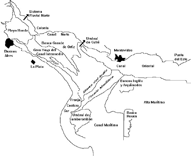 Las dos imágenes que siguen nos acercan a los compromisos mínimos visibles entre el sistema continental, la deriva litoral atlántica, la estuarial; y los corredores de flujo, aquí no graficados, que tradicionalmente gobernaron el sobrevuelo virtual de conflictos estuariales. A ellas les sigue una breve compilación de esbozos que guiaron con paciencia y esfuerzo nuestra reciente tradición sedimentológica estuarial. Y observaciones personales sobre ellas, a partir de una renovada mirada a enlaces termodinámicos, en el devenir de flujos y transferencias sedimentarias. Pequeño universo local de fenómenos termodinámicos que a mi Querida Musa Alflora Montiel, una y otra vez, aprecio siempre agradecer. Francisco Javier de Amorrortu, 30 de Mayo del 2010.