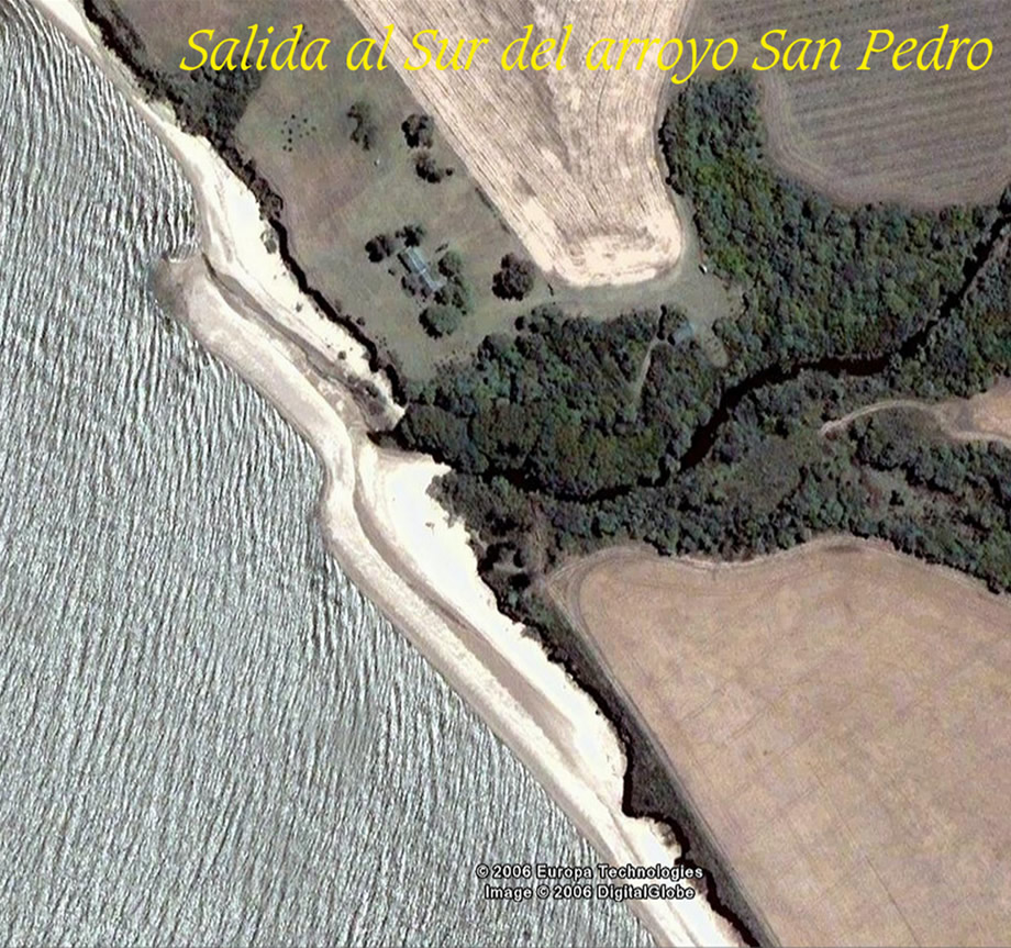 La imagen que sigue muestra los mayores desórdenes de salida provocados por canalizaciones en Samborombón. Un curso de agua que saca las aguas de frente es un curso de agua que se lleva de frente esa pared de la capa límite térmica que le hace precipitar su carga sedimentaria como tapón de frente a su propia salida en la forma menos apropiada y por ello la más desordenada. . . . Esto es lo que el Prof Dr Gregori Koff del laboratorio de Desastres geológicos de la Academia de Ciencias de Moscú les calificó a los técnicos de la Dirección de Hidráulica Provincial como el "desastre de Samborombón". . . . . . . . . . Y esa masa sedimentaria desordenada es la responsable de la gran carga de energía que asume el corredor convectivo interno Alflora que atraviesa el estuario desde Punta Piedras a Montevideo pasando entre los bancos Inglés y de Arquímides. . . . . . . . . . Valorando la función del cordón litoral emergido cuyo servicio de traslados de la salida tributaria a las espaldas de la deriva litoral ya se agotó, debemos apreciar que continuó prestando servicio para frenar las salidas directas de escurrentias territoriales al mar. En ausencia de ese antiguo cordón emergido por el paso de una motoniveladora se nos regala el fenómeno contrario a la deriva litoral: convecciones internas mudando a externas con los resultados a la vista que hablan con claridad meridiana del problema de sacar escurrentías directas al mar.