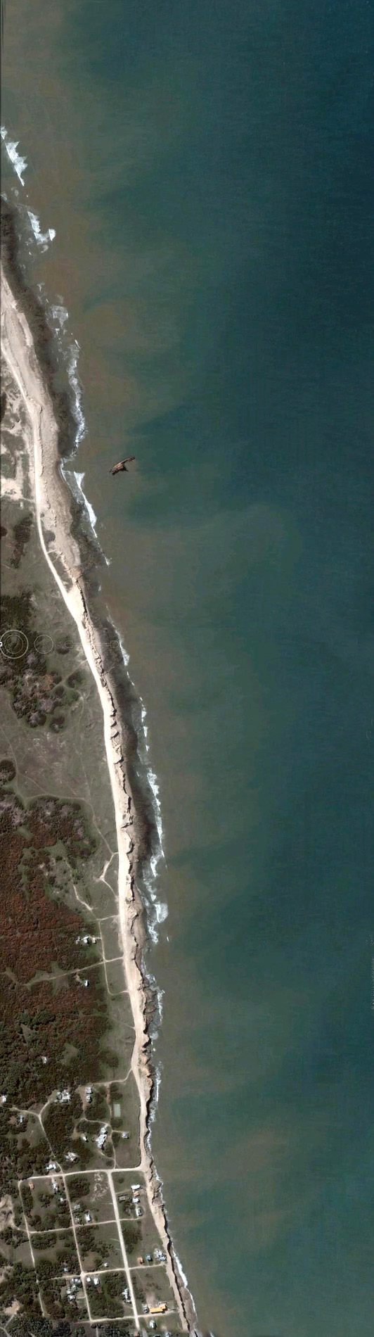 . . . . . . . . . La imagen que sigue muestra las milenarias acreencias a la salida del estuario del Caravelas al Norte de Brasil . En el centro a la izquierda se advierte una pista de aterrizaje regalando una idea de la escala de estas acreencias. La prolijidad de esas sedimentaciones de borde cuspidado en sucesivos cordones litorales que superan con holgura los 30 Kms de largo, debería permitir intuir la prolijidad con que opera el cordón sumergido que aún no está la vista. Decir que esto es fruto de la ola oblicua es pasar por mecanicista. Decir que esto es fruto de una interfaz cargada de delicados encuentros termodinámicos es pasar el mensaje regalado de una Musa. Cada cual elija.