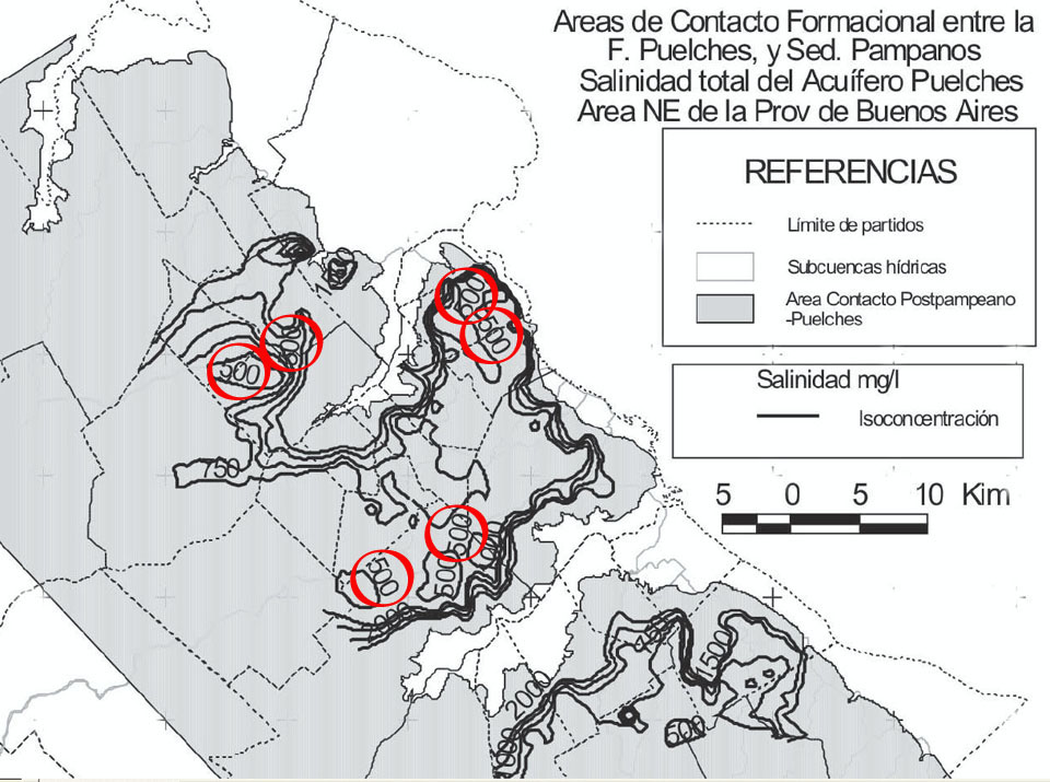 Siguen imágenes rescatadas del texto Relaciones estratigráficas e hidroquímicas de los acuíferos Pampeano y Puelches en el Noreste de la Provincia de Buenos Aires de los hidrogeólogos Sergio Daniel Amato y Adrián Silva Busso. "La pretensión de este trabajo ha sido correlacionar las facies litológicas de las diferentes unidades con las facies hidroquímicas" El círculo de la izquierda apunta al área de San Sebastián en Zelaya. El de la derecha a la franja entre el Luján y el Leder, al Norte del canal Arias El círculo en la imagen de arriba apunta a los alrededores de Los Cardales. El círculo de arriba a la izquierda apunta con sus -51 m a los alrededores de Campana-Zárate donde ya en 1993 Jorge Santa Cruz había observado importantes canales y erosiones. El círculo ligeramente más abajo y algo más a la derecha muestra 10 m en coincidencia con los 11 a 14 que señalan los EIA de Consultatio para esa zona de Escobar. Los círculos en la imagen de arriba muestran áreas con 500 mg/l. Incluso uno con 250 ml/l En planicie intermareal hoy los hay con 10 y 20 veces más. Y ya no sólo de cloruros y sulfatos, sino de cuanta miseria uno quiera imaginar. Imaginemos ese desastre con tendencia piezométrica inversa que a ello se arribará en poco tiempo viendo las condiciones del inmenso lodazal de 100 Km2 y menos de 80 cm de profundidad que se abre frente a la ciudad de Buenos Aites desde el Dock Sur hasta el Tigre y el agua a potabilizar no pueda ser de tan paupérrimo estuario capturada.