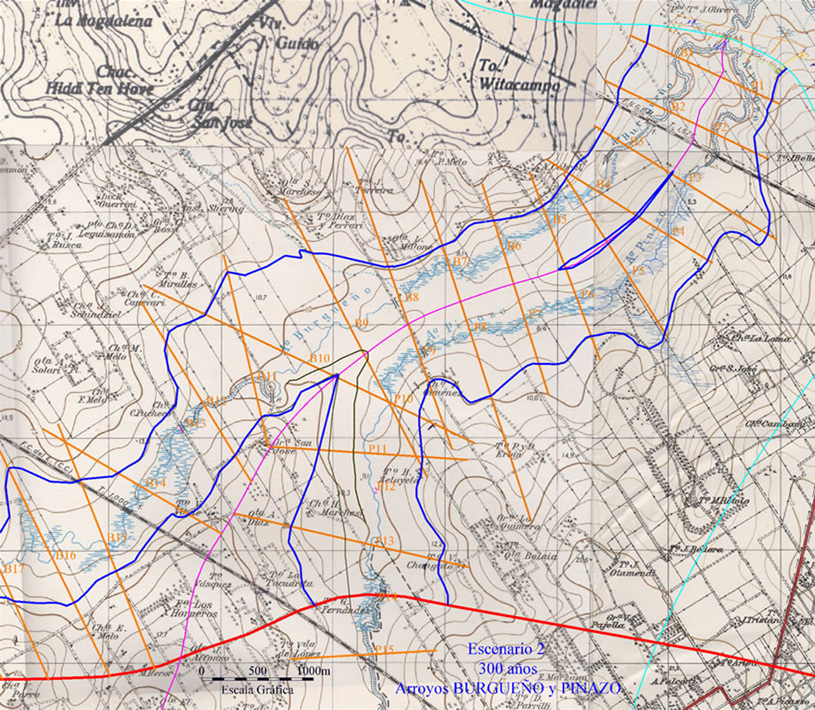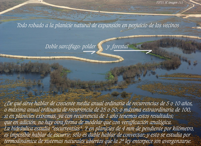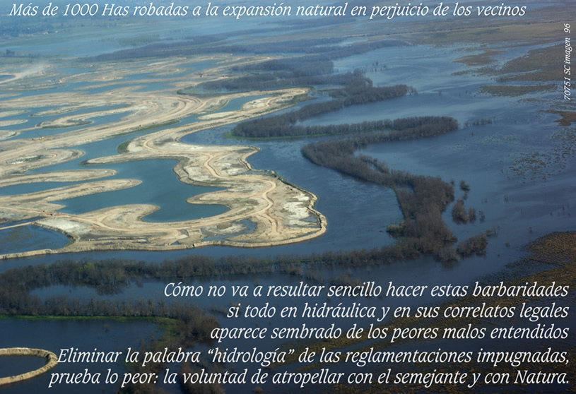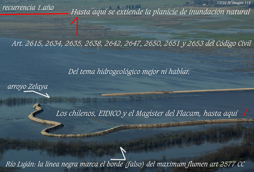 Esas “fajas laterales” pertenecen a lo que éste que suscribe llama cauce superior, pues el inferior no pasa de ser una mera sangría en relación a lo que expresa este curso de agua en recurrencias bien menores a trimestrales. A qué dudar que todos estos planos, fajas laterales, márgenes internas o externas o como quieran llamarlas, están tan comprometidos con lo que expresa el art 2340, inc 4º de CC respecto a deslindes públicos fundados en línea de ribera de creciente media ordinaria (rec menor a 5 años), que nadie dudaría en señalar pertenecen al dominio público imprescritible. Sin embargo. Allí, hoy mismo, la AdA regala sus aptitudes hidráulicas para fundar barrios cerrados arriba mismo del cauce principal del río Luján que hace 45 años fue borrado del mapa por un particular sin que jamás fuera denunciado. Y hoy que lo es, todos callados, nadie parece haberse enterado.