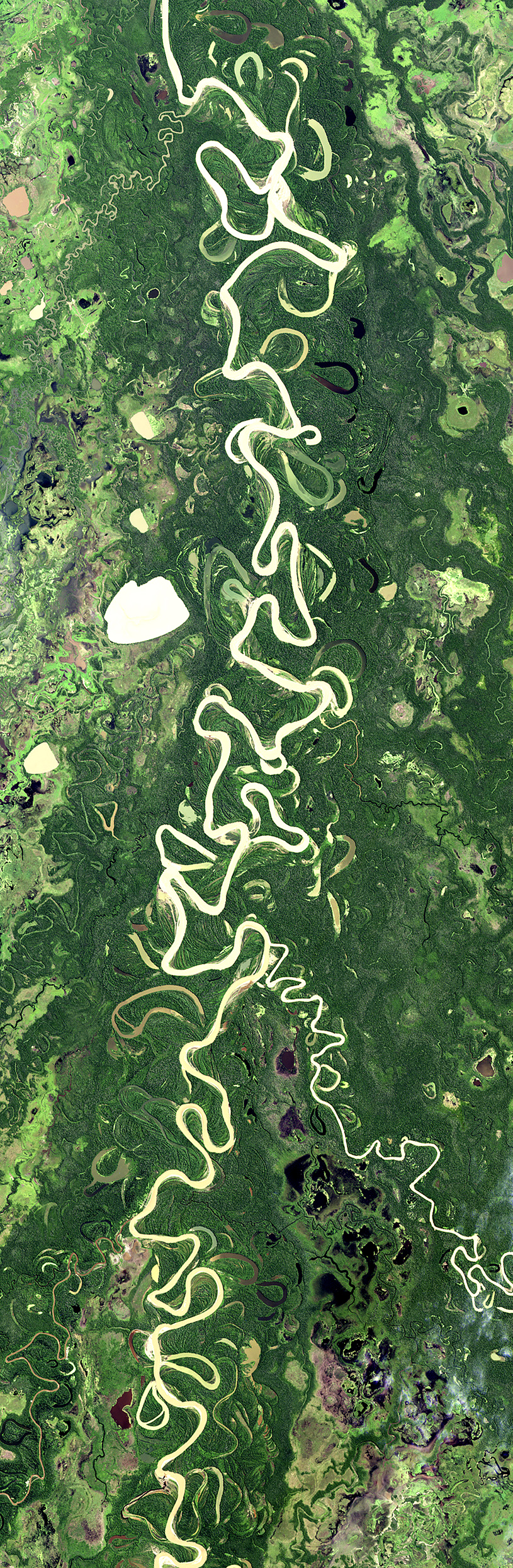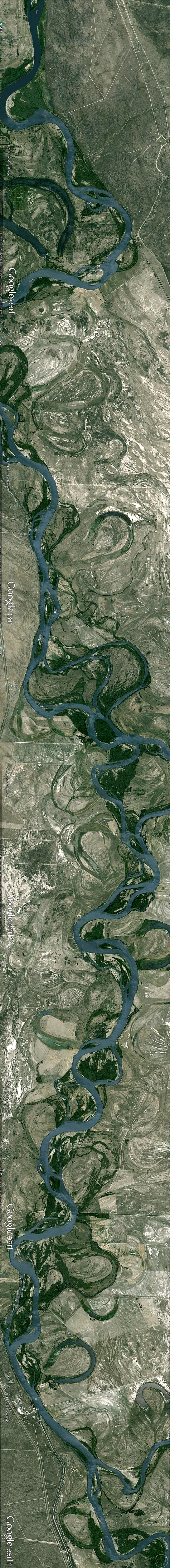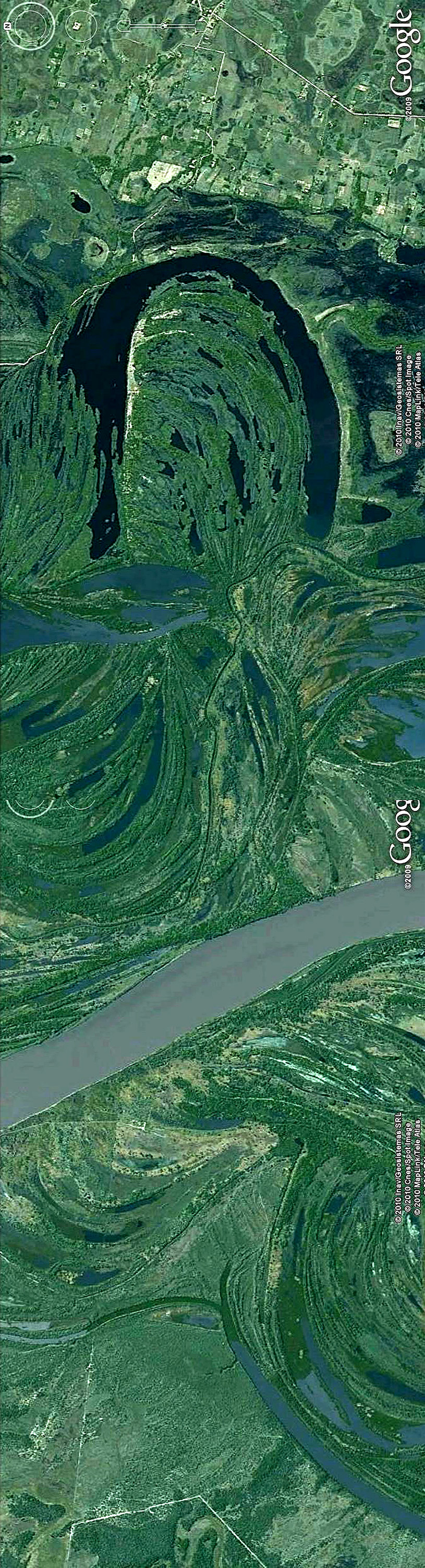 Menudo dolor de cabeza para las sencilleces con que Marienhoff pretendió enfocar y resumir estos temas de cauces y riberas. Esta imagen pertenece al curso de agua más importante del planeta. 12 veces más caudaloso que nuestro Paraná. Y a pesar de contar con la mitad de pendiente promedio saca sus aguas al mar al triple de velocidad. La única explicación es termodinámica fundada en la cantidad de calorías que absorben los suelos ecuatoriales. Estimo improbable exagerar si señalo que no menos del 80% de los cursos de agua del planeta que salen al mar a plataformas continentales que hoy lucen anchos no menores a los 100 Kms antes de llegar al talud, son cursos que reconocen en toda su cuenca baja estos pormenores que las ajenan de la ciencia hidráulica y del ojo mecánico, que siempre estiman energías gravitacionales donde no las hay. Estimar aportes del río Santa Cruz