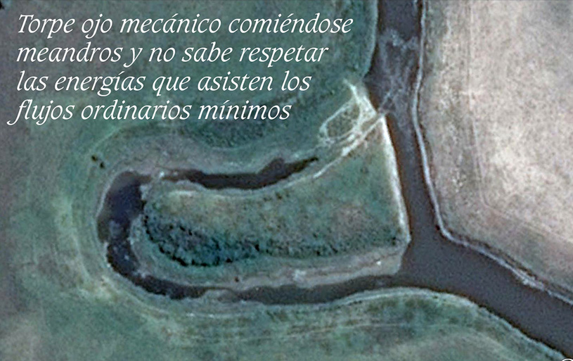 Esta imagen fue muy apreciada por Agnes Paterson, directora de todas las cátedras de Hidráulica de la UBA y a cargo de todos los equipos de investigación, que justamente estaba haciendo un estudio de transportes sedimentarios en aguas someras en planicies extremas con criterios mecánicos. Sencillo de imaginar los aprecios que regaló a esta imagen mostrando esa misma intención, pero descubriendo un territorio cargado de recursos termodinámicos (un 18/2/2012 visitando mi hogar). El reduccionismo de Marienhoff hoy nos imagina guíados por la función tecnológica y la noción de libertad de acceso a los puertos, y nos esquiva los accesos a los territorios donde los ojos aún no han visto, ni previsto, ni cultivado mirada termodinámica respecto a los equilibrios de los gradientes que asisten los enlaces de estos sistemas ecologícos en planicies extrems, que los arts 2º, inc e y 6º, par 2º, ley 2567 nos imponen mirar y respetar. Primero el buey, después la carreta Estos equilibrio merecen ser considerados antes de entrar a tallar provechos “tecnológicos y libertarios”. Una costa, una playa, una margen, una ribera, un curso de aguas disociadas, son desde el punto de vista de una ecología de ecosistemas, materias muy anteriores a los provechos, a los recursos, a las funciones tecnológicas, a las analogías, a las doctrinas y a las libertades.