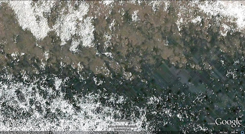 Con el arribo del nuevo Código Civil es llegada la hora de resolver estas cuestiones empezando por lo que ven nuestros ojos, antes de escuchar palabra alguna o imaginar analogía alguna, estimando que esa mirada original no atenta contra el espíritu de ninguna ley dispuesta a ver repaso de sus trascendencias. Los límites de todos los cuerpos de agua deben entonces establecerse por analogía con los de los mares, ríos y canales navegables, ya que todos ellos tienen la importante función de permitir el transporte por agua, aunque en escala muy diferente según el caso. Esta importante función tecnológica es el origen de la libertad de acceso a las costas". En la imagen que sigue no hay cauce a la vista, no hay costas, no hay riberas menores a 200 veces mínimo el ancho del curso del Luján, y en estas paupérrimas condiciones de ver los límites volar por los aires, mostramos una pequeña porción del brazo interdeltario del Luján en los bañados de Zelaya tras una lluvia de recurrencia menor a 90 días y una "franja" externa, interna o como quieran llamarla, no menor a 5 Kms de ancho, fotografiada 8 días después de caída la lluvia y descubriendo a nuestros ojos asombrados un microsistema del tipo propio de los esteros, creado en forma espontánea por Madre Natura, ocupándose de traducir la energía solar atrapada por las aguas y las propias vegetaciones aflorantes, en energías convectivas cuyas marchas se advierten bien definidas en la imagen. Esas energías así capturadas, así transferidas y así integradas a las dinámicas de esa planicie (cauce superior del Luján) descubriendo a nuestros ojos un delicado y silencioso ecosistema ocupándose de sacar con sus flujos convectivos estos excesos que en el año 2014 se regalaron no menos de 9 veces. Recurrencias de 40 días propias de crecidas ordinarias mínimas y no medias (rec 5 años)
