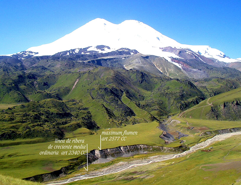 "El Diccionario Jurídico Abeledo-Perrot —citando a Marienhoff, pp. 224-225— dice al respecto lo siguiente": "Las riberas no son otra cosa, pues, que una parte del lecho de los cursos de agua. Sin embargo es muy general el error de llamarle ribera a esa zona inmediata y contigua a los ríos que no hace parte de su lecho; esta zona contigua se llama margen, y en los ríos navegables constituye la franja de treinta y cinco metros instituida para el servicio de la navegación. La diferenciación clara y precisa de lo que es ribera y de lo que es margen está expresada en el artículo 35 de la ley de aguas de España: según dicho texto las riberas son las fajas laterales de los álveos de los ríos, hasta el límite que las aguas alcancen en sus mayores avenidas ordinarias, y márgenes son las zonas laterales que lindan con las riberas. Dialéctica ciega en la Claridad mecánica que imaginan Ese precepto es terminante, pues establece con toda claridad que las riberas pertenecen al lecho del río, mientras que las márgenes son las zonas laterales de los ríos y que, por lo tanto, no pertenecen a su álveo. Más adelante la ley de aguas española concreta aun más el alcance de su artículo 35, pues, al referirse a la servidumbre de sirga, establece que ésta se instituye sobre los predios contiguos a las riberas (artículo 112), es decir, no se instituye sobre las riberas; a mayor abundamiento, dicha ley dispone en su artículo 113 que el gobierno determinará la margen de los ríos en que haya de establecerse la expresada servidumbre. Para ello es menester un estudio de hidrología de creciente media ordinaria “normal”. Con línea de ribera de creciente media ordinaria tenemos para devolver al dominio natural o ecológico y al dominio público, lo que ninguna S. Corte, ni ningún político se han animado a considerar. La letra ya está. Pero nadie se anima a interpretar su música. Por este motivo han hecho desaparecer de la reglamentación del Código de Aguas provincial por dec 3511/07, las 7 veces que el primero mencionaba la palabra "hidrología". Así de primarios y regresivos. En este punto arranca mi próximo trabajo. "Rescatamos de la ley de aguas de España: según dicho textolas riberas son las fajas laterales de los álveos de los ríos, hasta el límite que las aguas alcancen en sus mayores avenidas ordinarias, y márgenes son las zonas laterales que lindan con las riberas". Veamos este caso de las fajas laterales de los alveos de los ríos hasta el límite que alcancen las avenidas ordinarias, no importa si mayores o pequeñitas. Tomemos por caso un arroyo Pinazo de 2 metros de ancho que genera avenidas de 500 m de ancho no menos de 4 veces por año; habiendo llegado a generar avenidas de 1800 m de ancho en planicies de 30 cms de pendiente por Km.