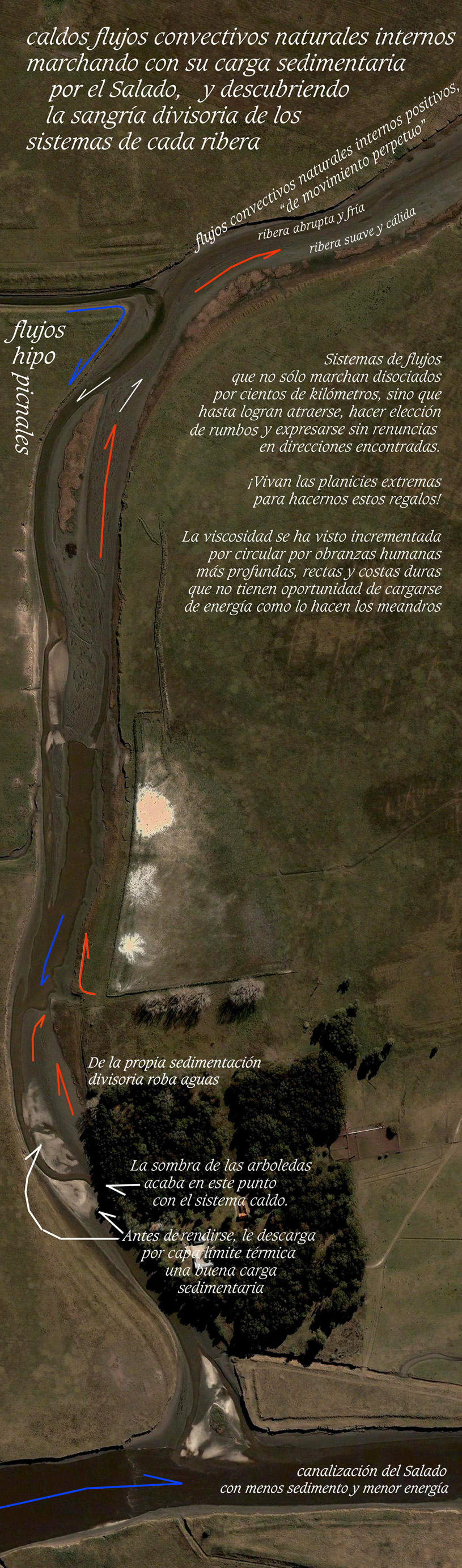 ¿Se resolverán estos dilemas repitiendo la "suma claridad" de los asertos de Marienhoff recién comentados? Sugiero comparar esa claridad con la que regala este video: https://vimeo.com/126978075 Resumen de doctrinas en desquicios ilustrados Los desastres y apropiaciones de dominios públicos muestran que aún poniendo el nombre que fuera a los cauces, a las riberas, a las márgenes o a lo que fuera, todo queda en el plano discursivo al que ningún ejemplo concreto parece tener cabida y mucho menos, respuesta concreta. Ni hablar si pretendemos adjudicar a los cauces, a las riberas, a las márgenes y a lo que fuera, compromisos termodinámicos que ponen en fuga a todas las leyendas y a cualquier jurisprudencia. Los alcances y límites semióticos, semiológicos y semánticos, incluídas sus respectivas hermenéuticas, sus multiplicadas analogías y sus derechos comparados, fundados a partir de cajas mecánicas y credulidades de que los rios descienden por pendientes hacia el mar en lugar de convectar hacia el mar, tratándose de cuenca baja donde no hay pendientes mayores a unos pocos milímetros por Km, son tan elementales como las pirámides de Egipto. Los cauces no transportan a los ríos; tampoco sus riberas, ni sus márgenes, ni sus franjas laterales; llámense avenidas o simple diminutas sangrías. Pero gracias a aprecios de ecología de ecosistemas en planicies extremas hoy vamos descubriendo los gradientes termodinámicos que enlazan y comprometen a todas esas localizaciones. Y no precisamente para que naveguen embarcaciones, sino para que asistan los acopios y transferencias de energías solares (convectivas), que dinamizan las aguas en planicies extremas.