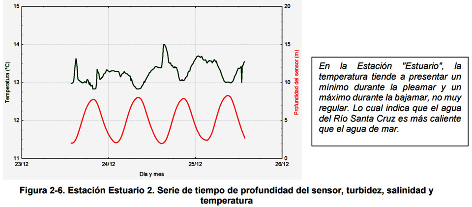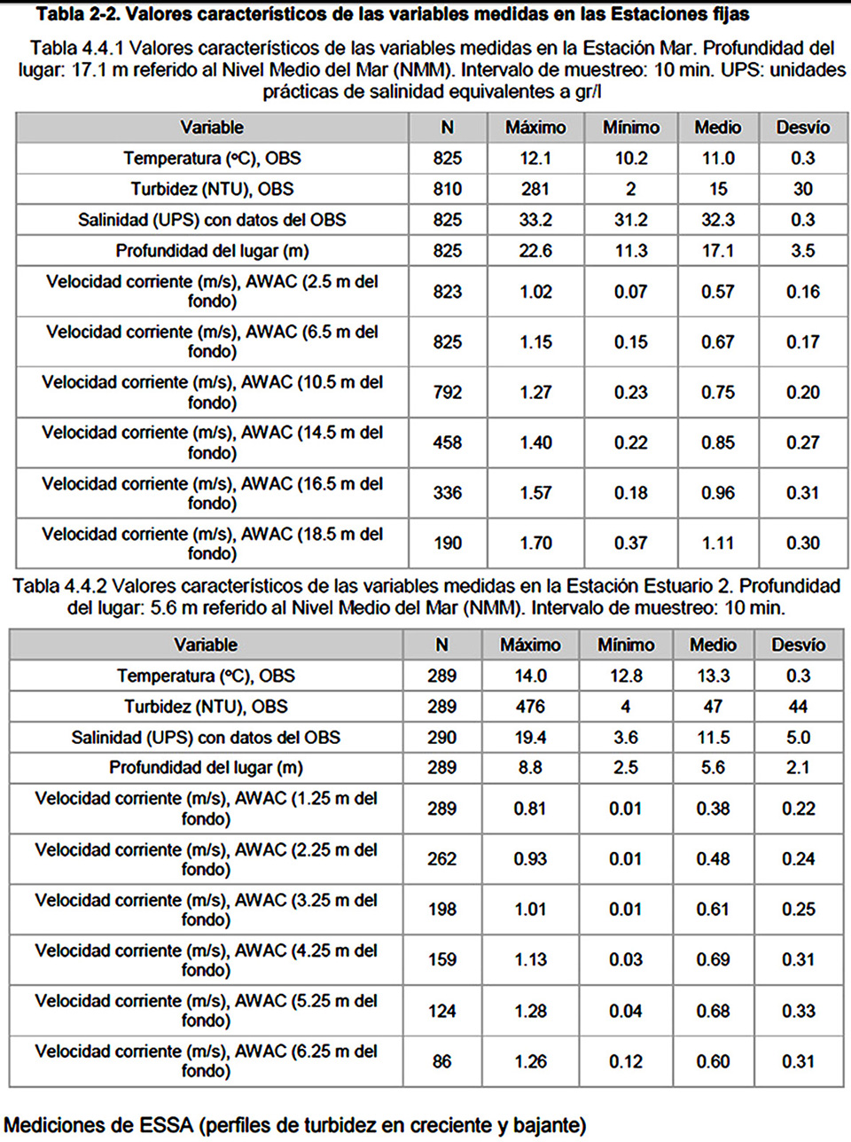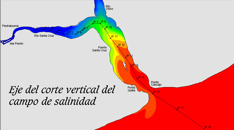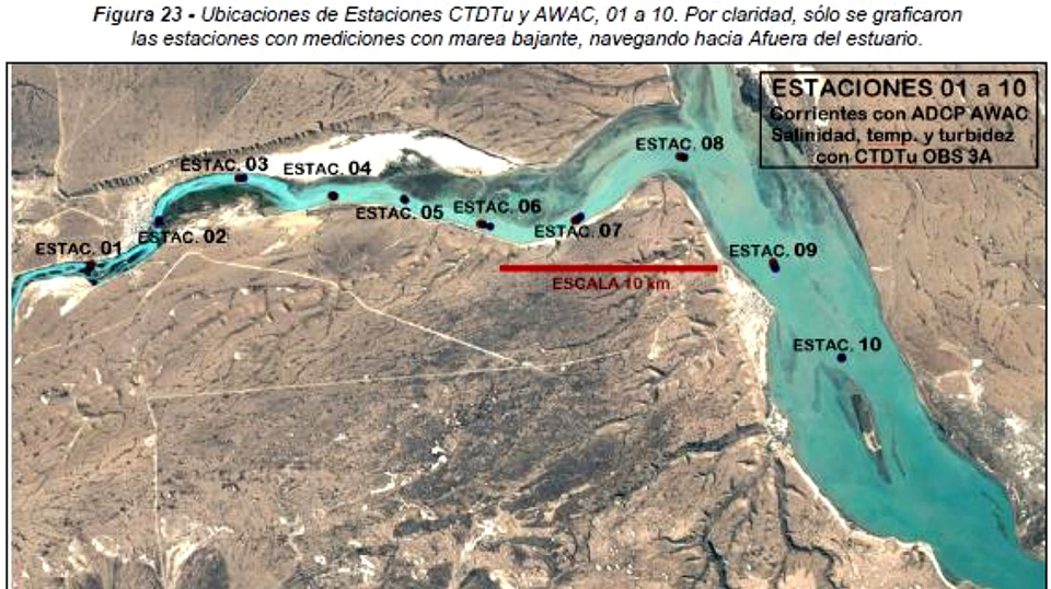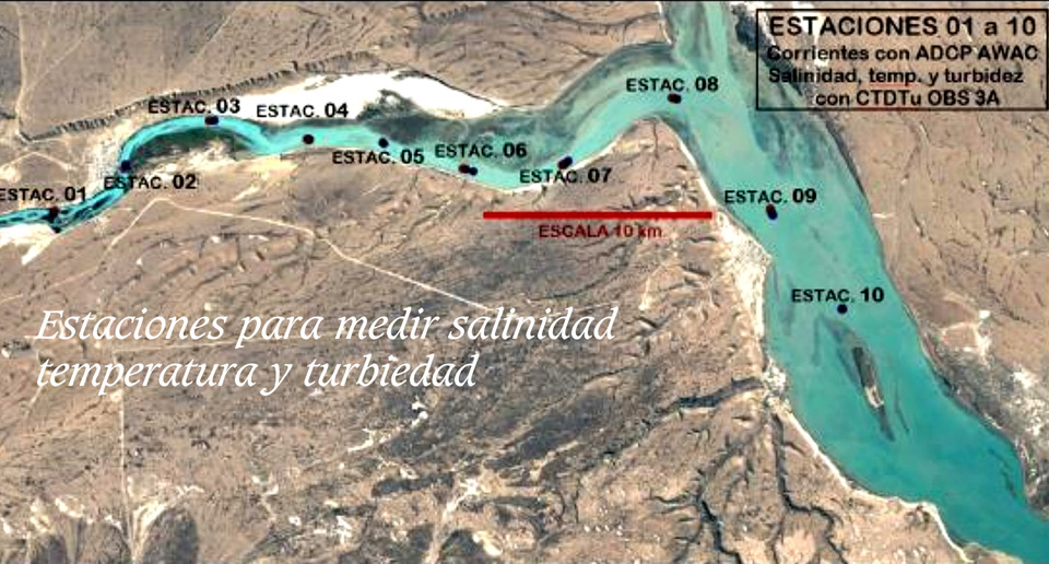 CAPITULO 3 . LÍNEA DE BASE AMBIENTAL Y ESTUDIOS ESPECIALES PUNTO 2 - MODELACIÓN HIDRODINÁMICA, DISPERSIÓN Y TRANSPORTE DE SEDIMENTOS EN EL ESTUARIO DEL SANTA CRUZ La consultora Ezcurra Schmidt vino a asumir la dura tarea de acopio de información de la dinámica de lo que ellos llaman "estuario" y éste que suscribe, "ría", pues su profundidad no tiene las características propias de generación y sostén termodinámico que tienen los primeros. En términos mecánicos, el calor no conforma trabajo y por ello no es en estos estudios una variable de peso medular, que incluso vaya acoplada a los sedimentos, a cargo de atesorar calorías. Por ello, los flujos disociados de un río con diferentes cargas sedimentarias, muestran al más cargado, marchando a más velocidad. Tal el caso del Río Negro y el Solimoes. La mirada a la condición picnal no sirve de nada. El volumen de intercambio mareal en esta ría es del orden de 1120 nillones de m3 por ciclo. Por lo tanto, muy superior a los caudales erogados por la presas. Lo que ya daría lugar a pensar en una usina mareomotriz. Los datos de turbiedad recogidos por este equipo de ESSA son los que luego toma el Dr Menéndez para inferir que la reducción de sedimentos al final del curso antes de entrar a la ría será de un orden aprox al 50% Las estaciones de acopio de información turbiedad, salinidad y temperatura de ESSA no permiten inferir la presencia de interminables corredores de flujos disociados que reducen el valor de esta información a poco menos que cero. Solo refieren de datos en un punto central de cada una de esas 10 estaciones, que nada infieren de la complejidad de sistemas apareados y disociados presentes en la ría.