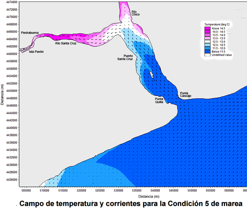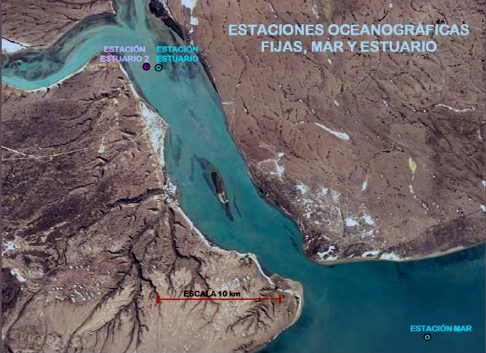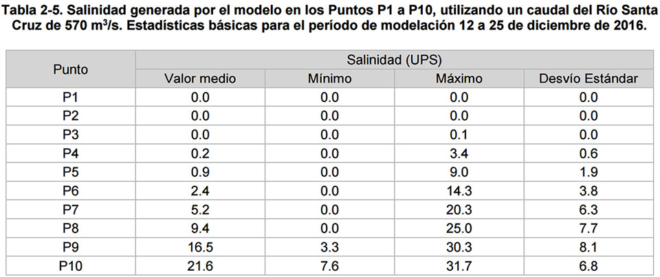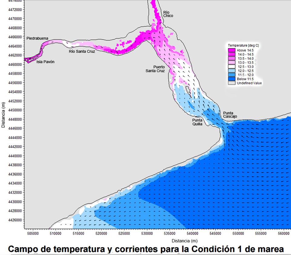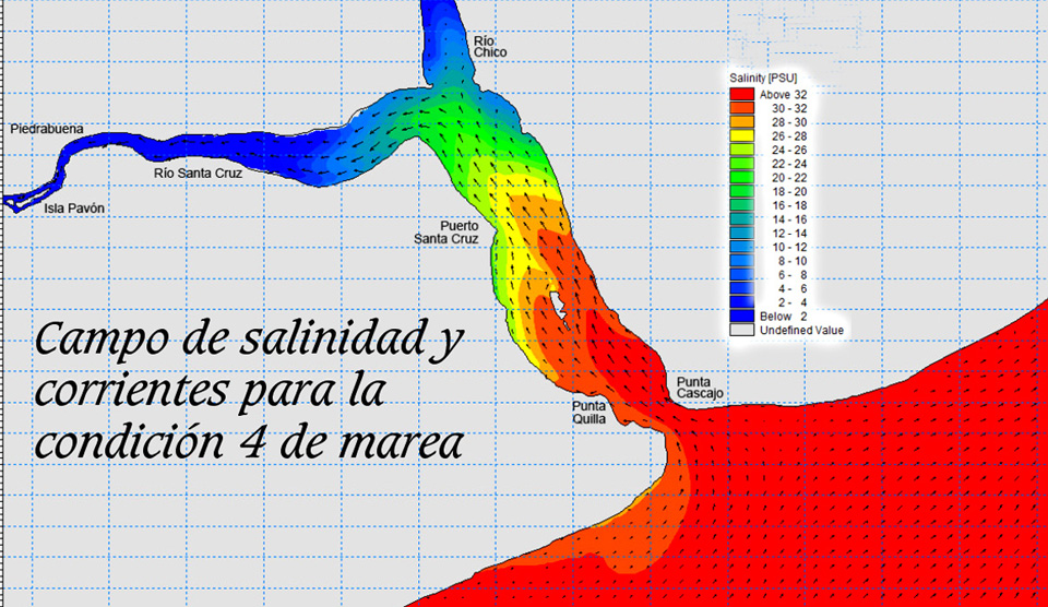 CAPITULO 3 . LÍNEA DE BASE AMBIENTAL Y ESTUDIOS ESPECIALES PUNTO 2 - MODELACIÓN HIDRODINÁMICA, DISPERSIÓN Y TRANSPORTE DE SEDIMENTOS EN EL ESTUARIO DEL SANTA CRUZ La consultora Ezcurra Schmidt vino a asumir la dura tarea de acopio de información de la dinámica de lo que ellos llaman "estuario" y éste que suscribe, "ría", pues su profundidad no tiene las características propias de generación y sostén termodinámico que tienen los primeros. En términos mecánicos, el calor no conforma trabajo y por ello no es en estos estudios una variable de peso medular, que incluso vaya acoplada a los sedimentos, a cargo de atesorar calorías. Por ello, los flujos disociados de un río con diferentes cargas sedimentarias, muestran al más cargado, marchando a más velocidad. Tal el caso del Río Negro y el Solimoes. La mirada a la condición picnal no sirve de nada. El volumen de intercambio mareal en esta ría es del orden de 1120 nillones de m3 por ciclo. Por lo tanto, muy superior a los caudales erogados por la presas. Lo que ya daría lugar a pensar en una usina mareomotriz. Los datos de turbiedad recogidos por este equipo de ESSA son los que luego toma el Dr Menéndez para inferir que la reducción de sedimentos al final del curso antes de entrar a la ría será de un orden aprox al 50% Las estaciones de acopio de información turbiedad, salinidad y temperatura de ESSA no permiten inferir la presencia de interminables corredores de flujos disociados que reducen el valor de esta información a poco menos que cero. Solo refieren de datos en un punto central de cada una de esas 10 estaciones, que nada infieren de la complejidad de sistemas apareados y disociados presentes en la ría.