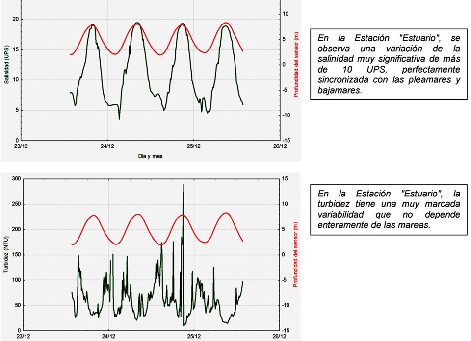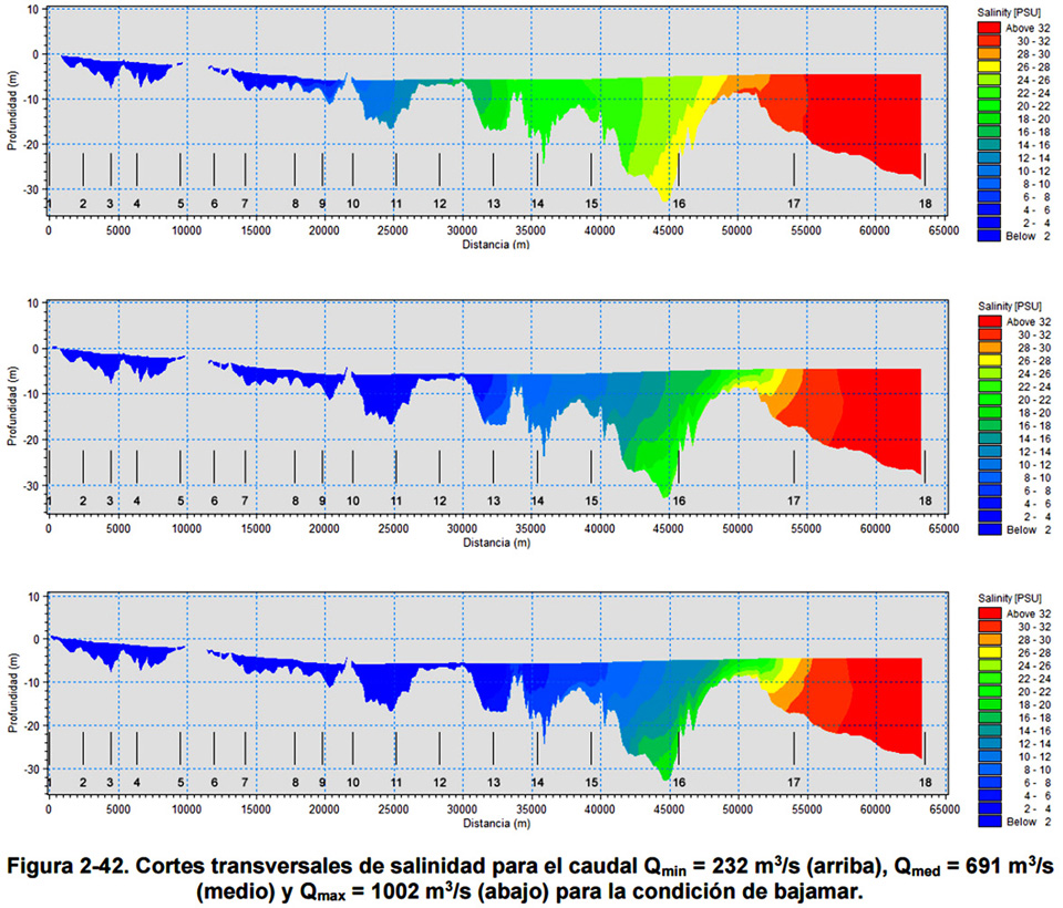 Otro trabajo de este tipo fue realizado por este mismo equipo en el río Paraguay para ver las consecuencias de vertidos. Trabajo que Petrobras Energía S.A. en el 2010 le encomendara, con el pretexto de realizar un Mapa de Sensibilidad Ambiental. Las mismas observaciones caben a este ejemplo citado en último termino, visible por http://www.alestuariodelplata.com.ar/asuncion3.html A modeladores e investigadores que acopian data, resulta inconcebible tener que asumir disociaciones en sistemas convectivos basados en diferencias de apenas 0,2º y mucho menos, aceptar que sus flujos no fueran laminares. Por eso, a pesar de la honestidad acreditada de un hombre como Horacio Ezcurra, no le acredito en estos enfoques nada de lo más elemental que permita inferir que estamos mirando por "ecología de ecosistemas hídricos"; que al decir del glosario de la ley 11723 para la voz "ecosistema", es un sistema termodinámico, natural, abierto y al comienzo de este html, por ellos mismos también expresado. Aquí todo es mecánico y naturalmente, mucho más simple de modelar, aunque las principales energías, las que se exhiben según sus propios dichos, en "(sistemas predominantemente verticales)" y sus delicadezas -por no llamar complejidades-, estén por completo ausentes. De carga sedimentaria no tenemos otras estimaciones que las inferidas por el el equipo: Dr. Ángel N. Menéndez, Ing. Nicolás D. Badano, Ing. Leandro Kazimierski, al parecer desde el informe de turbiedades, temperaturas, salinidades y velocidades de ESSA.