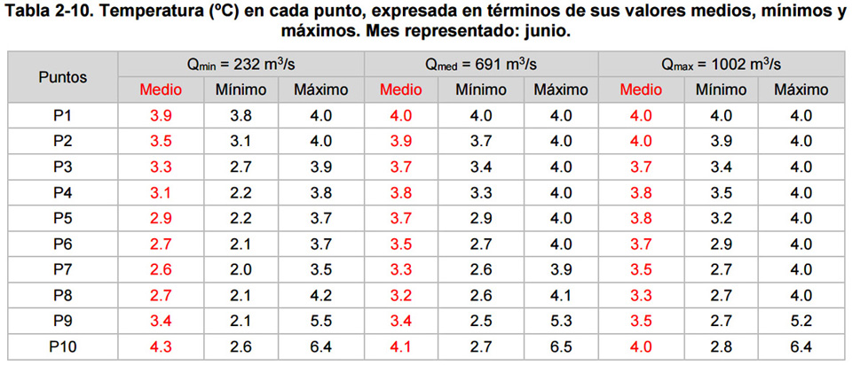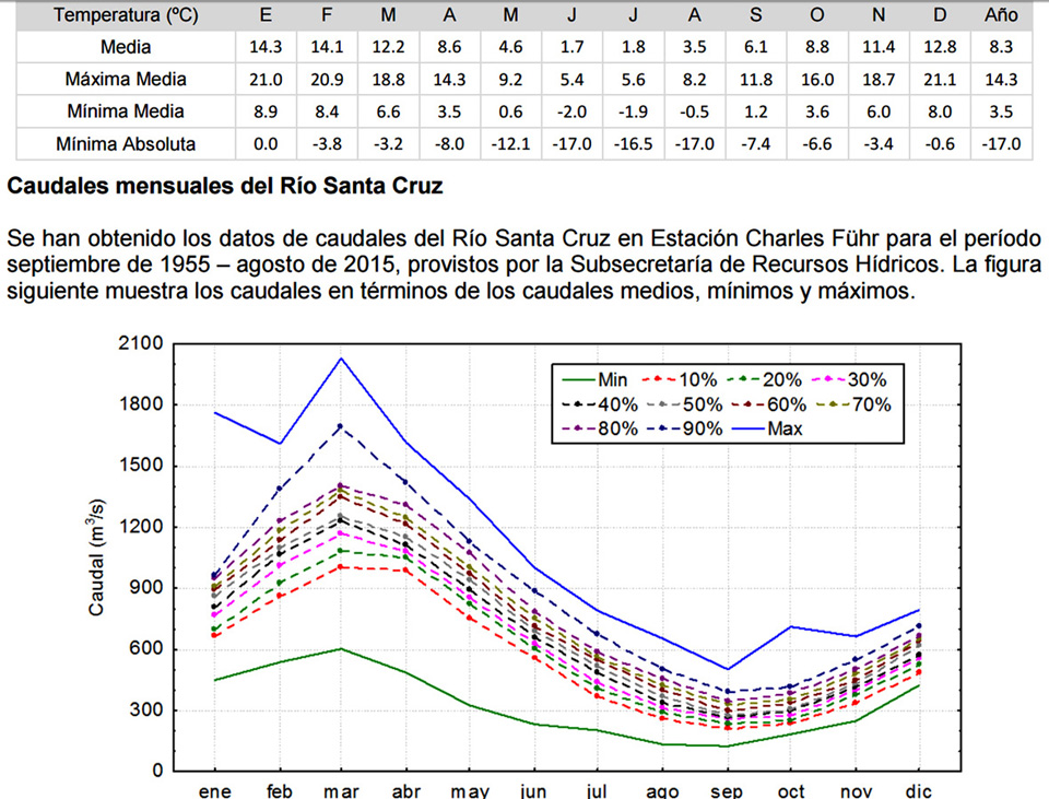Modificación potencial del régimen térmico del río. . . Tal como fuera considerado en el EIA original del proyecto (Serman & asociados s.a. (2015) para Represas Patagonia), como consecuencia de la inercia térmica de la masa de los embalses que serán construidos, se espera que se generé una disminución próxima a dos grados en la temperatura máxima del agua durante el verano y un aumento próximo a un grado en la mínima absoluta de invierno. Por la configuración geomorfológica de los embalses, su profundidad y tasa de renovación del agua, no se esperan condiciones de estratificación térmica estable estacional en ambos cuerpos de agua ni limitaciones, en la concentración de oxígeno en la columna de agua. En la sección fluvial ubicada aguas abajo de JC, como parte del EIA original se consideró que la retención de caudal durante la operación podría producir un descenso de la temperatura mínima invernal del agua del río. Al respecto, como parte de las campañas de línea de base ambiental se registraron en el curso del río temperaturas de 12 grados en verano y de 3 grados en invierno (Cdte. Luis Piedra Buena), para caudales altos y bajos respectivamente, advirtiéndose una relación directa entre temperatura del agua y caudal. Durante la fase de aguas bajas, coincidente con el inverno, el río tiene 300-400 m3s-1 (200 m3s-1 en bajantes extraordinarias) y 1.200-1.700m3s-1 durante las crecientes anuales. Cuanto menor sea el caudal, menor será la velocidad del escurrimiento (mayor tiempo de residencia del agua que ingresa al sistema), y mayor contacto con la temperatura del ambiente (aire y lecho del curso), influyendo también la mayor densidad del agua, que se da aproximadamente a 4 grados. Con un caudal menor a lo que se ha determinado como caudal ecológico Q7-10 es muy probable que el agua se congele durante el invierno, en cuenta que, durante la LBA se pudo registrar, el 13 de julio de 2015, temperatura de sólo 3 grados en el río Santa Cruz, en su intersección con la Ruta 3 (Cdte. Luís Piedrabuena), con caudal 80% superior al denominado caudal ecológico.