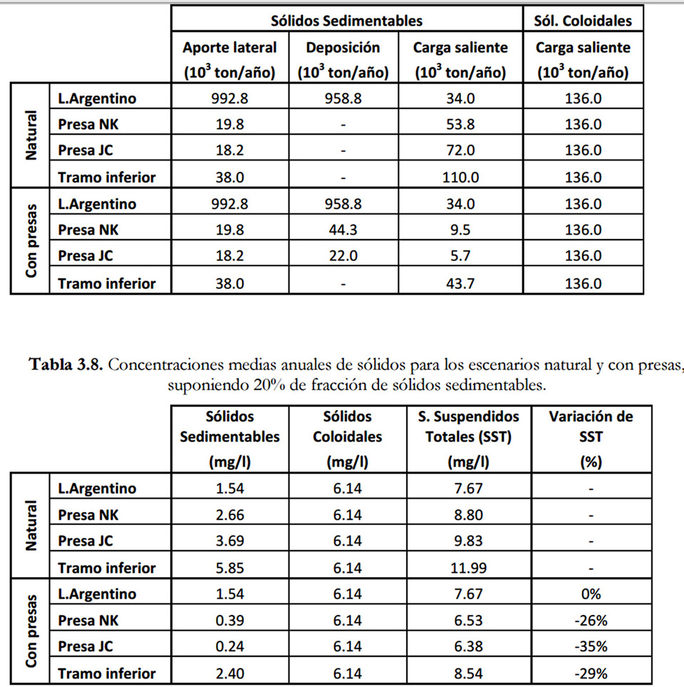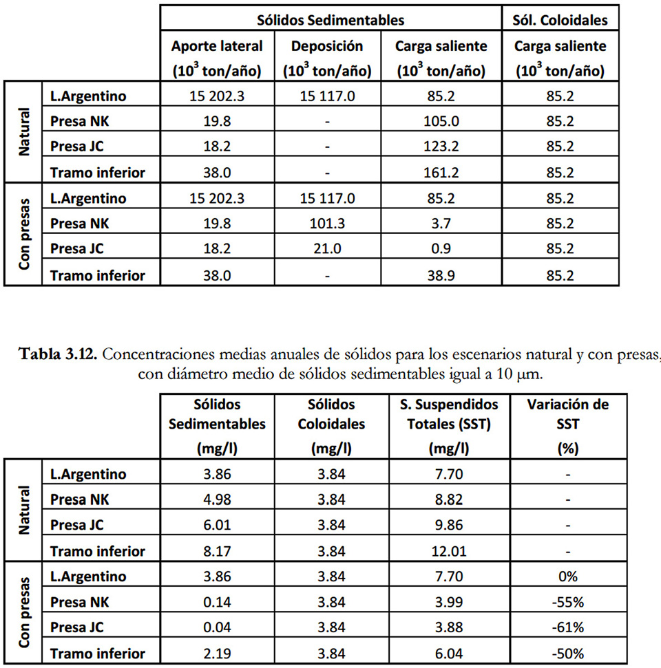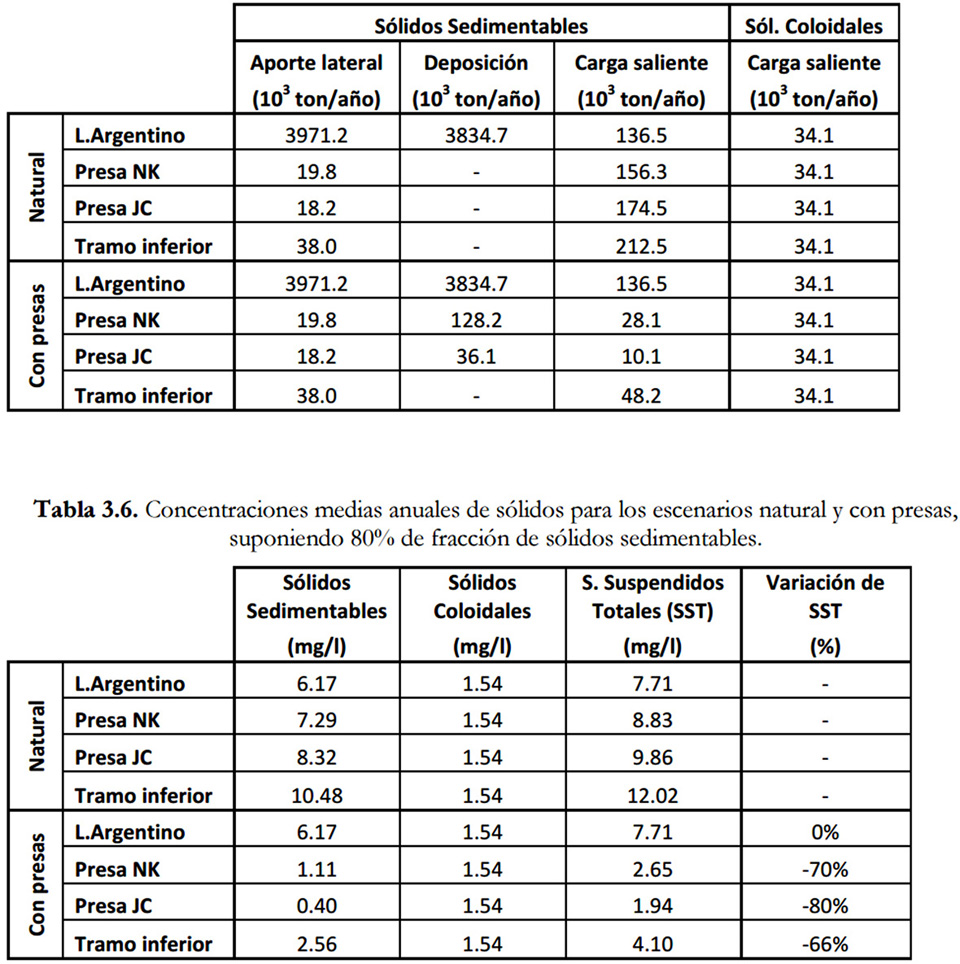 Balance medio anual de carga sólida para los escenarios natural y con presas suponiendo 80% de fracción de sólidos sedimentables