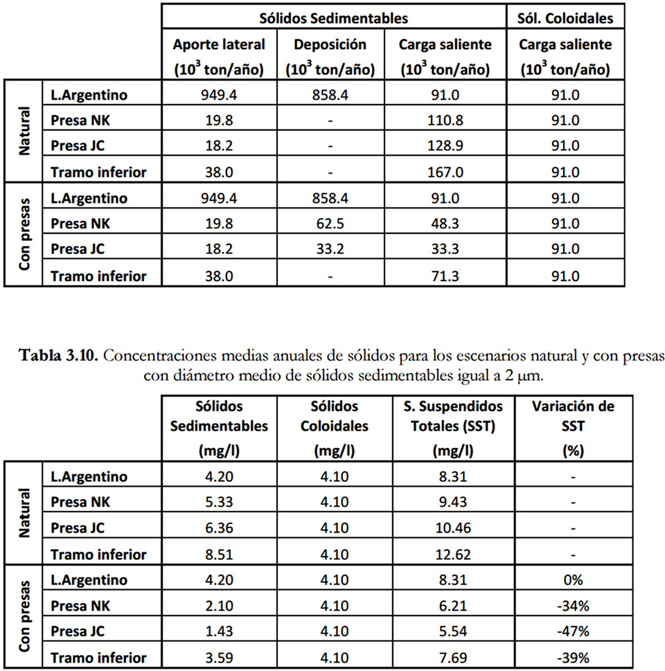 Balance medio anual de carga sólida para los escenarios natural y con presas con diámetro medio de sólidos sedimentable igual a 10 micrones