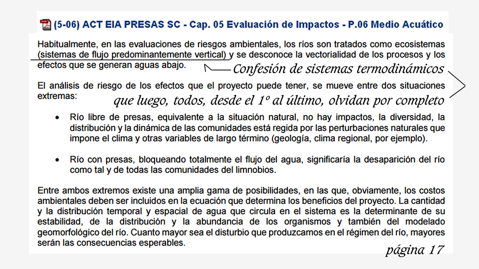 Del informe sobre el "Medio acuático" "Habitualmente, en las evaluaciones de riesgos ambientales, los ríos son tratados como ecosistemas (sistemas de flujo predominantemente vertical) y se desconoce la vectorialidad de los procesos y los efectos que se generan aguas abajo. El análisis de riesgo de los efectos que el proyecto puede tener, se mueve entre situaciones extremas". Aprecio dar comienzo este repaso de análisis con esta confesión puntual que solo encontré una sola vez en estos días repasando la extensa lista de documentos aplicados a esta actualización de los EIA de las represas. Así me ahorro de defender la soledad con que una y cien veces hago incapié en energías convectivas (sistemas termodinámicos verticales), que a excepción de esta mención aislada, nunca aparece en ningún lado. Todo es inferido en términos mecánicos y jamás en términos termodinámicos de sistemas naturales abiertos y enlazados.