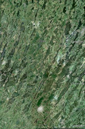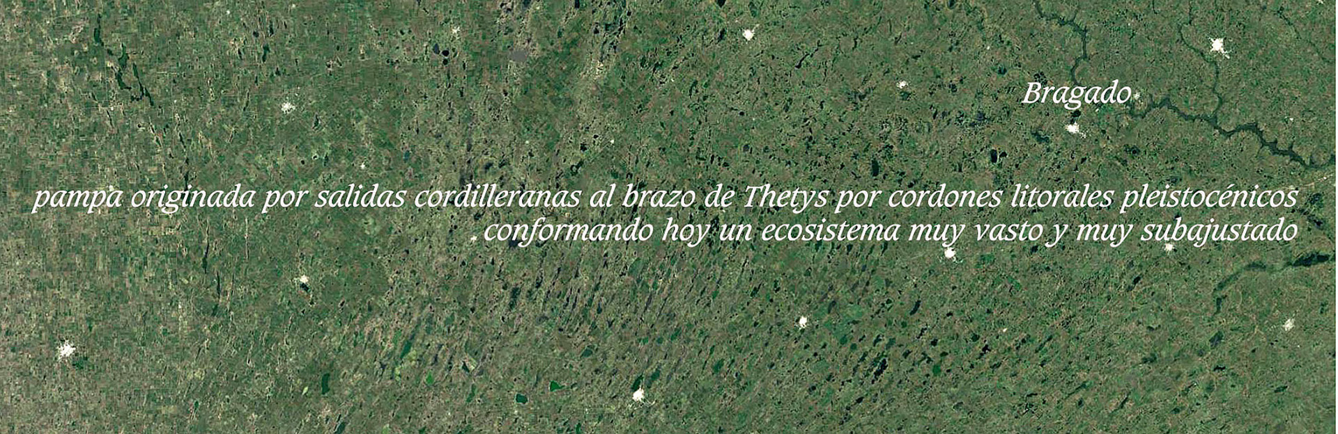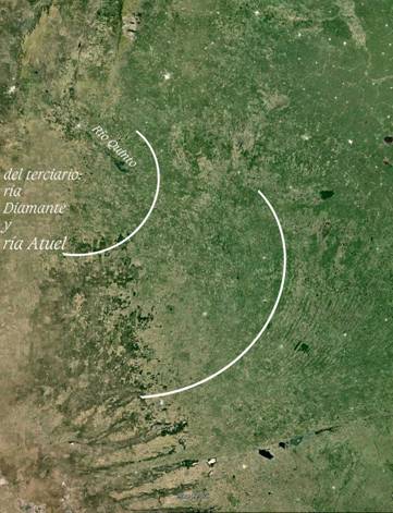 Las ríadas que se advierten a la derecha de la imagen conforman formidables conos de deyección de aportes sedimentarios cordilleranos con registros geomorfológicos que hablan de grandes caudales y energías en un tardío mioceno; con bocas de ingresos en las actuales cotas a 300 y 250 m, a las salidas en la interfaz de un mar pampeano miocénico en las actuales cotas de los 200 a los 150 m. Estas formidables energías vienen acreditadas por la amplitud de las rías y su persistente reiteración, progradando al Sur en número aprox a los 12 hasta el eje de las Encadenadas y 4 adicionales hasta el eje de la ría de Bahía Blanca. Progadación que responde, reitero, al desarrollo de la fractura terciaria al Sur de las sierras de San Luis, impidiendo que cursos como el Tunuyán, Desaguadero, Diamante y Atuel continuaran oficiando sus descargas en la dirección O-E. marpampeano 1 . 2 . 3 . 4 . 5 . 6 . 7 . 8 . 9 . 10 Rías que aún hoy acercan registros visuales satelitales superlativos, exhibiendo en la longitud aprox a los 66º O y desde los 34º 35' a los 38º S, frecuencias del orden de los 22 a los 25 Kms. y largos que hoy aún descubren 50 Kms en el primero al Norte, hasta 200 Kms en los que le siguen al Sur. La imagen muestra las acreencias que seguían a continuación de estas rías en la interfaz del retiro gradual del mar pampeano miocénico, por generación de cordones litorales de salidas estuariales en un área al O de unos 100 Km de ancho, por 300 Km de largo. Area expresada entre las líneas de la imagen que sigue