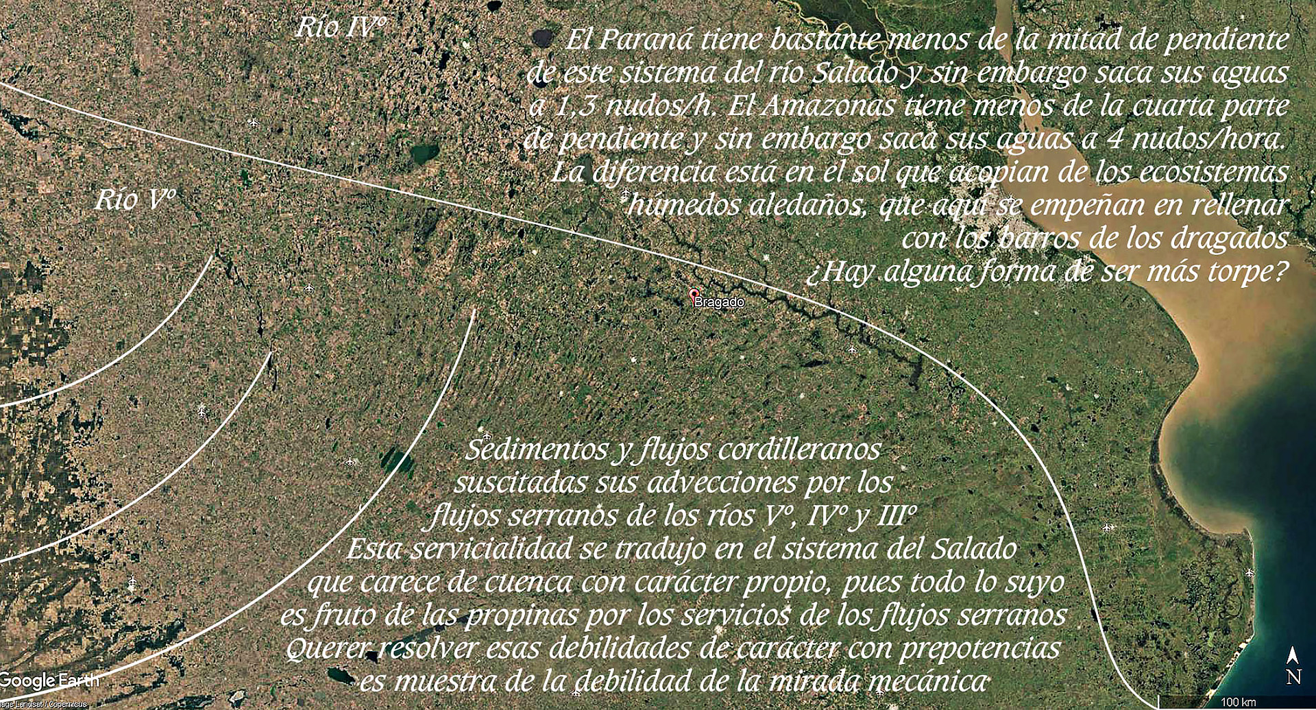 Respecto de esta mentada cuenca del Salado aprecio señalar que nunca fue en los últimos 500.000 años "cuenca", sino "la propina" que le dejaron al Río V por haber oficiado los delicados gradientes térmicos determinantes de las advecciones de los sedimentos y flujos cordilleranos durante al menos los últimos 2,5 millones de años. La expresión "cuenca de sedimentación" ya nos pone en alerta del carácter o aprecio gravitacional que se supone reina en ella. En lugar de estimar cuáles son sus virtudes o aptitudes para estimular las dinámicas de los transportes sedimentarios, los geólogos apuran aprecios a los depósitos. Siempre ha sido así y no será menor el esfuerzo para cambiar de actitud. La caída de la manzana ha quedado rigidizada en su física matemática. Se miran caudales de entrada y de salida y en modelos de caja negra resuelven lo que nunca modelizaron, ni infirieron por fuera de las variables conocidas. Nunca tuvieron presente alguno los sistemas “convectivos” y los determinantes horizontales “advectivos”. Con semejante economía es inevitable que después de 380 años les cueste abrir los ojos a las energías que brotan en Natura. El ligero y gradual plegamiento al Sur de las sierras de San Luis impidiendo la salida Oeste-Este de los flujos cordilleranos de los antepasados del Tunuyán, Diamante, Atuel y tantos que ya borraron sus huellas, obligaron a buscar salidas al Sur por latitud 35º S , longitud 65º 40' O, y a medida que el plegamiento aumentaba y los senos de salida se tapaban seguir descendiendo hasta los 38º S. Este proceso es el responsable, junto a los al Norte comparables de los Río IV y III, de la formación de al menos los últimos 700 m de suelos pampeanos hasta hoy atribuidos al sistema paranaense. Que por ello doy en llamar mar pampeano, dejando las dunas para el recuerdo de los despistes geológicos en postrer olvido. La salida hacia el O, N y NE de los sedimentos y flujos cordilleranos cuyas advecciones fueran suscitadas por los flujos de estos tres cursos serranos, recibió como premio sus correspondientes "propinas", a las que la voz "cuenca" les queda un poco grande. Querer resolver la "personalidad" de estas "cuencas" con créditos del cretácico a 7000 m de profundidad, habla de que el imaginario humano no tiene límites. Tampoco su catecuménica analógica mecánica ceguera.