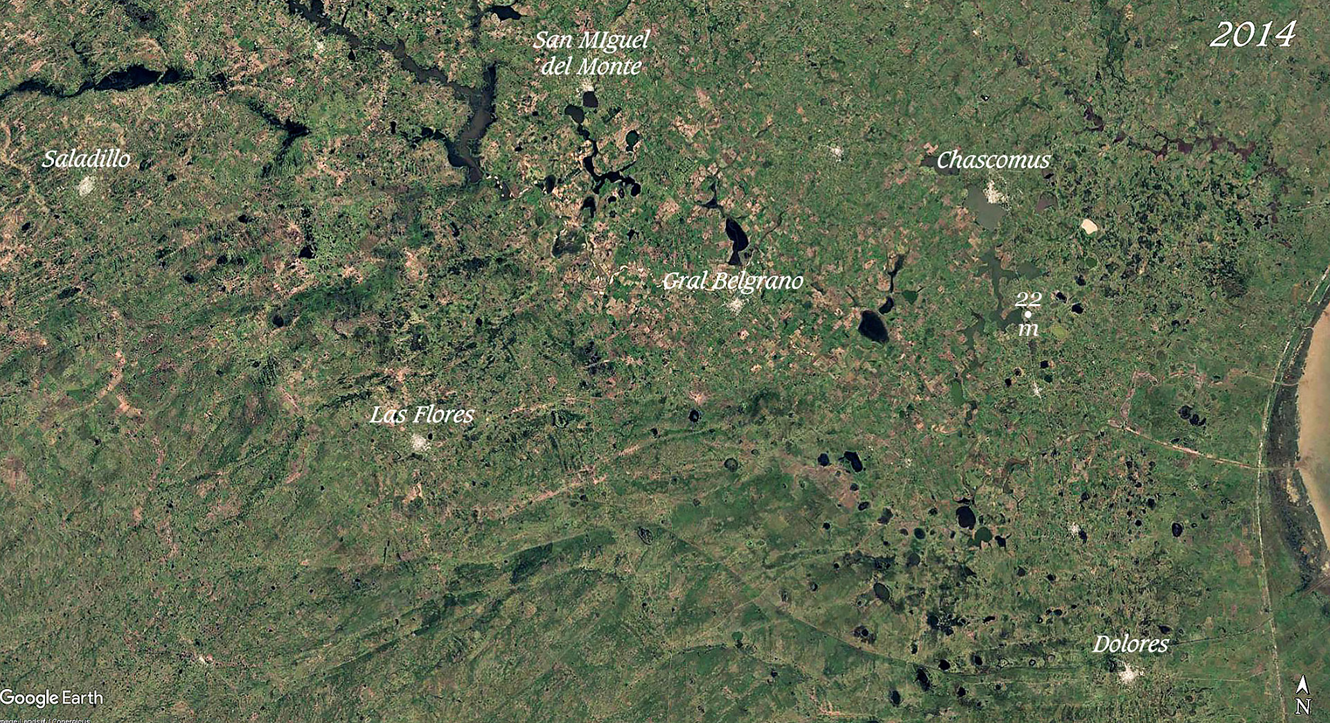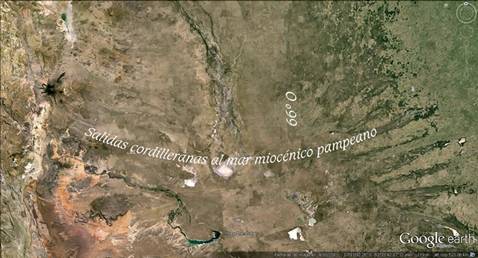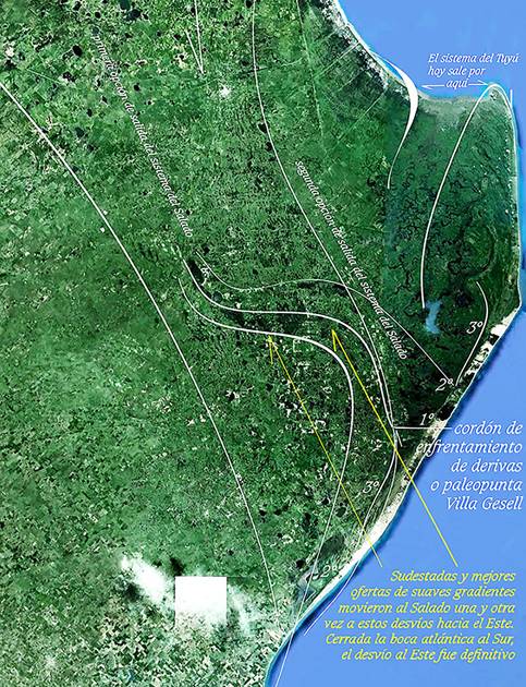 Las imágenes que aún hoy guardan grabadas las dinámicas de los cordones litorales de salidas tributarias en interfaces marinas a lo largo del tardío Mioceno, reconocen comienzo en la actual cota de los 300 m en la longitud 65º O, a 750 Km de distancia de la actual ribera atlántica. No estoy en condiciones de inferir que esa cota fuera la de aquellos tiempos del tardío Mioceno, o fuera fruto del desplazamiento y alzamiento de las placas; o herencia en plenillanura sureña de la fractura de las sierras de San Luis. Basta una elevación de tan sólo media décima de milímetro por año, para en 5 millones de años superar ese desnivel de aprox 250 m que se interpone a las salidas del Oeste en directo a la planicie.Por lo tanto, tampoco infiero que el mar pampeano miocénico hubiera alcanzado esas alturas, o fueron socavados sus accesos para dejar allí grabados esos tránsitos de las formidables rías; y ya en planicies marinas con aguas más someras, los bordados cuspidados de los cordones litorales que siguieron.http://www.alestuariodelplata.com.ar/salado2.html A estos aprecios a las “nacientes” del sistema del Salado cabe le sigan el de las “salientes” al océano, incluídas sequías e inundaciones Sequías 1574-76, 1614-1617, 1700-1710, 1729-1730, 1747-1749, 1771-1773, 1805, 1824 y 1832-33, 1879, 1910, 1929-1930, 1950-1952, 1956. Inundaciones. En 1857 un barco a vapor partiendo de Buenos Aires y subiendo por el Salado llega hasta la laguna de Samborombón. Imposible de no haber abierto una canalización. Que por cierto, jamás resolvería la disociación advectiva con las riberas de la bahía Hasta hace 1.500 años el Salado salía por la cara SE del cordón pleistocénico de Villa Gesell, al que se ve como línea delgada ligeramente curvada y cruzada al final de la carta y por cierto, anterior a la formación de las barreras de médanos de hace 1500 años.