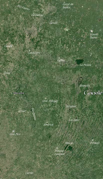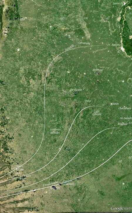 Las imágenes que siguen intentan mostrar las delicadezas de un sistema de compromisos advectivos de tres cursos serranos con las rías de descargas de flujos cordilleranos en cota 360 a 250 m en la longitud aprox a los 66º O y desde los 35º a los 38º S, con frecuencias del orden de 22 a los 25 Kms. y largos que hoy aún descubren 50 Kms en el primero al Norte, hasta 200 Kms en los que le siguen al Sur.