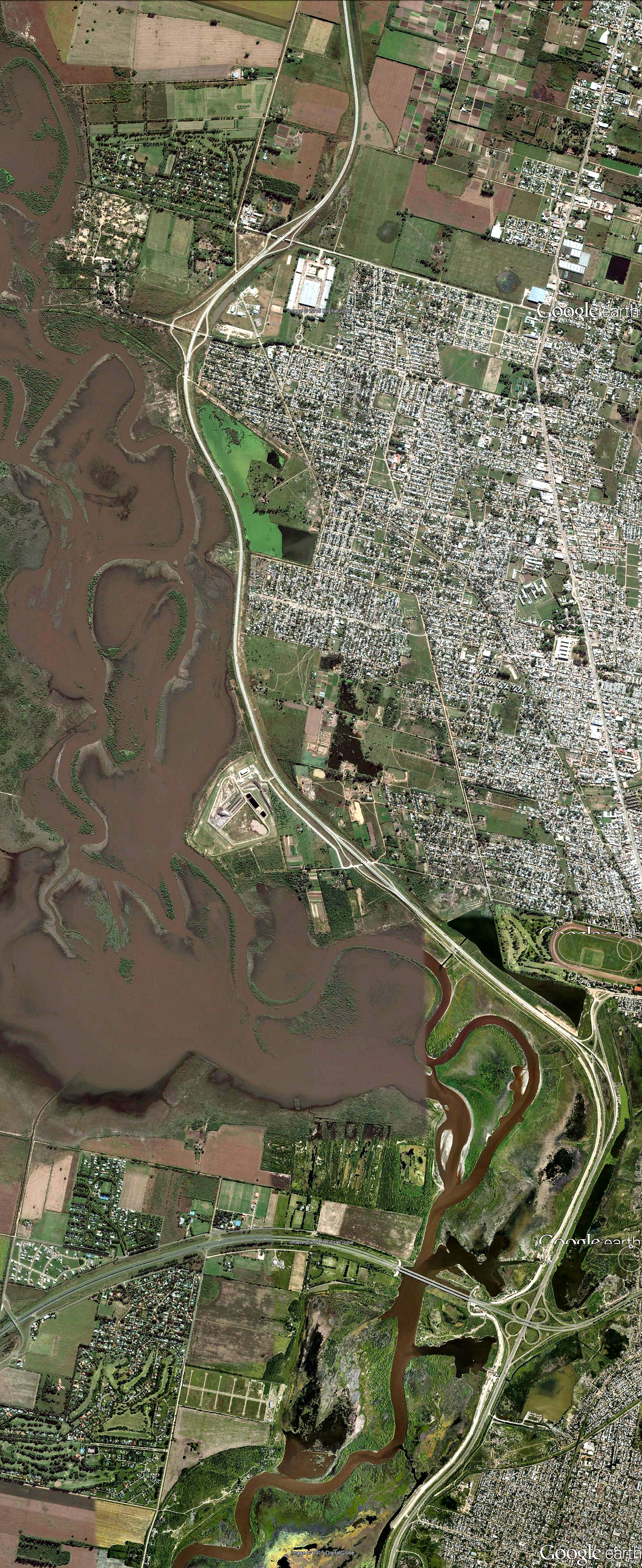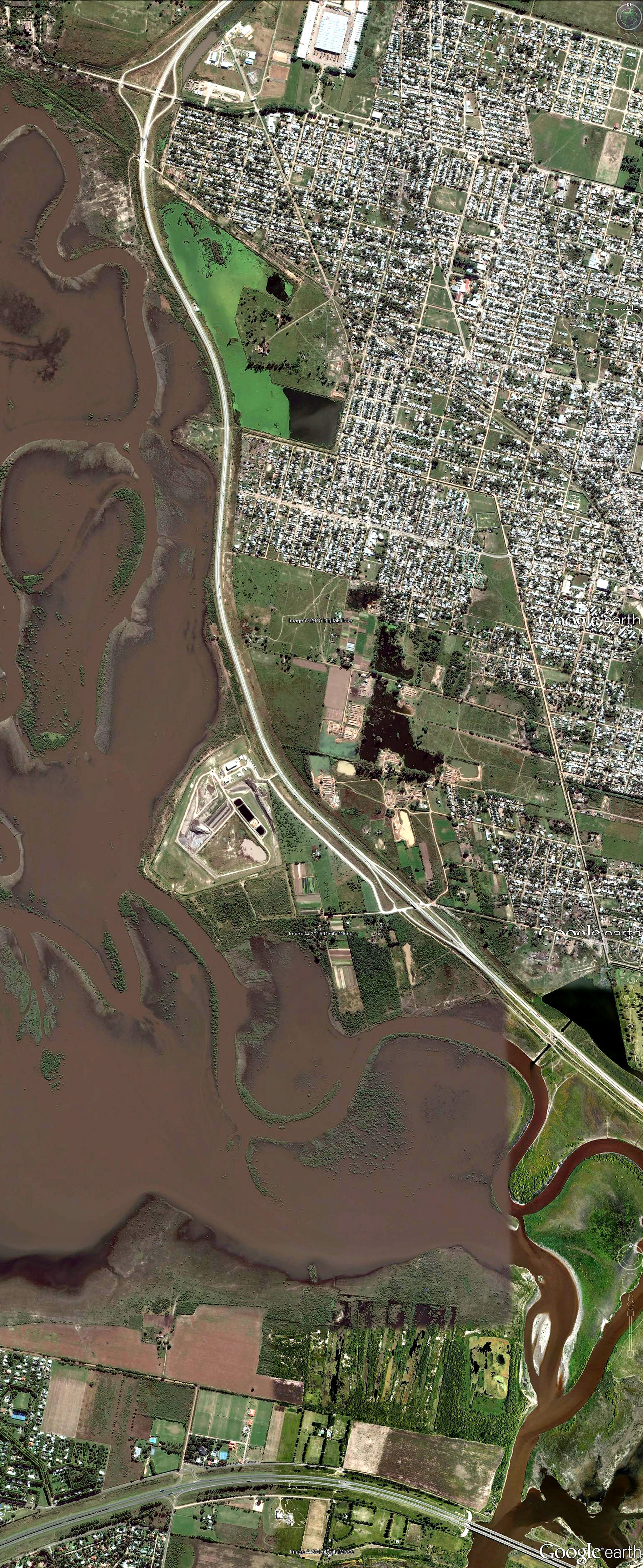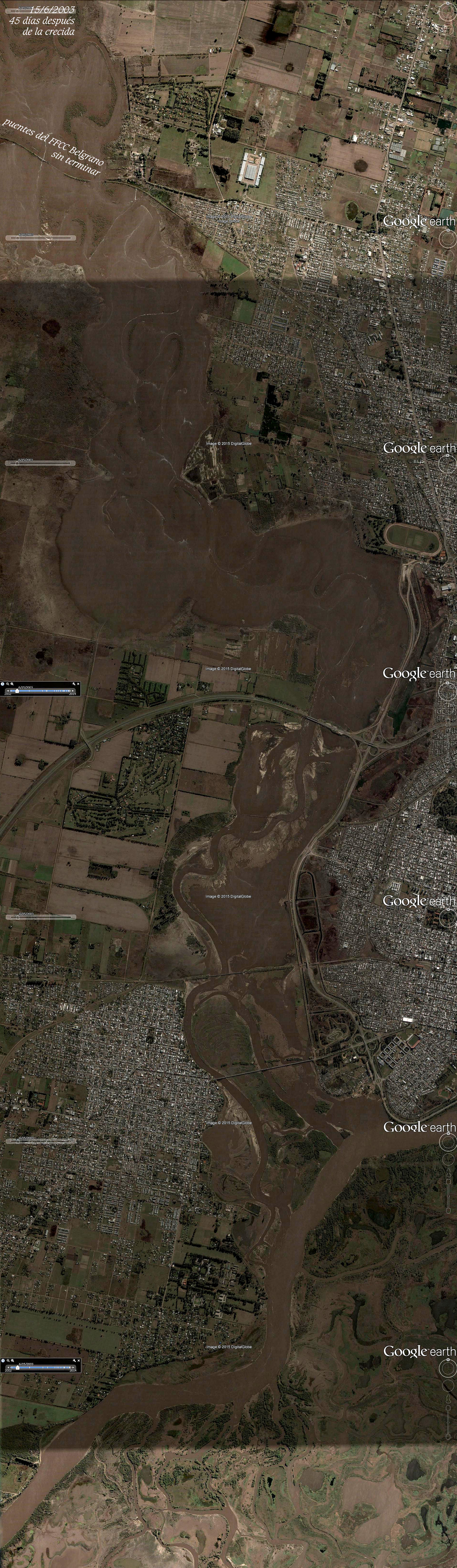 La caja del Salado reconoce 4 Kms de ancho a la altura de la abandonada traza ferroviaria. Ésto es: 8,200 Km aguas arriba de este barrio cerrado en gestación a 1200 m de la vecina costa dura. ¿No hay acaso un ingeniero que les avise que están violando el art 2340, inc 4º del Código Civil? ... y que todo este bastardeo lo resuelven ellos con prometedoras obras, que siempe Natura prueba una y otra vez ruinosas. ¿No sería mejor considerar que las leyes no son "literatura" y que sus prometedoras soluciones son fruto de un ciego catecumenismo mecánico que escapa a los abismos que les abre el paradigma termodinámico?