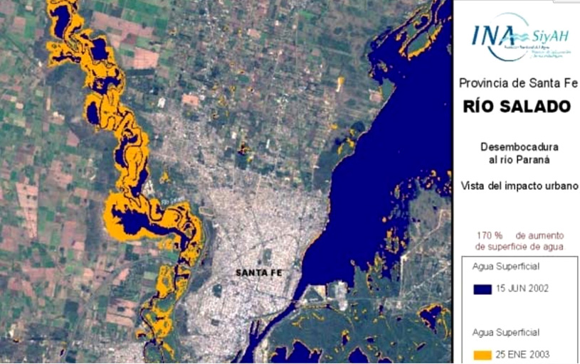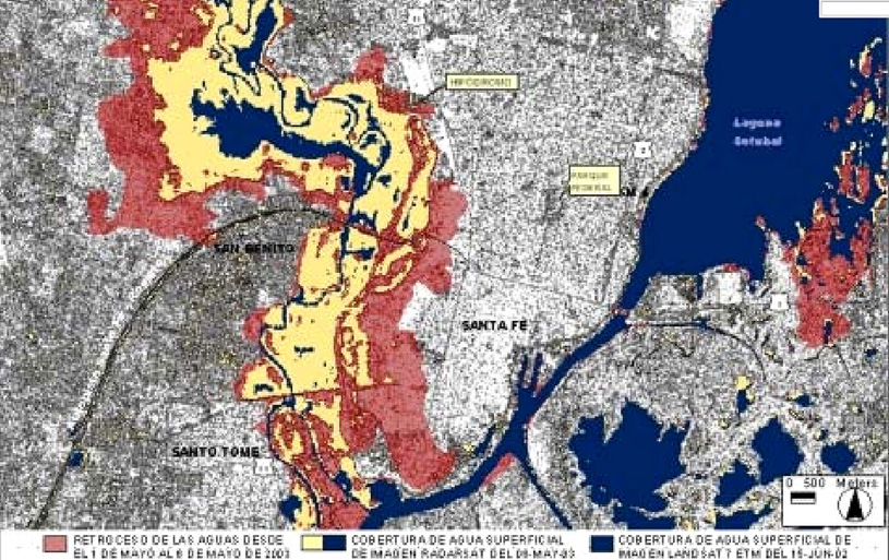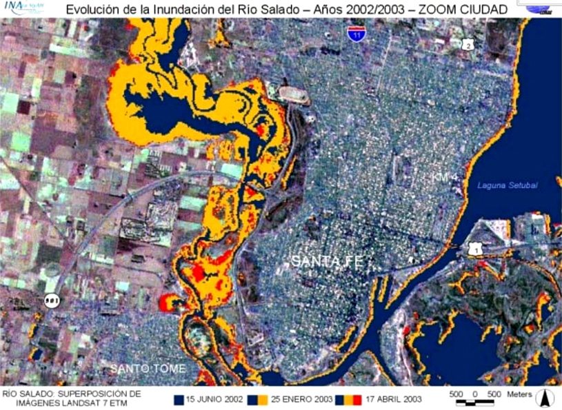 La imagen RADARSAT (resolución de 10 metros) utilizada, de fecha 6 de mayo, permitió observar el impacto en el radio urbano, visualizándose el retroceso de la cobertura de agua en superficie para esa fecha. Se integró en un multitemporal esta información SAR con información proveniente de sensores ópticos. De esta manera, se pudo comparar el grado de recuperación de las áreas urbanas que fueron anegadas. En la imagen siguiente se observa en color rojo el área recuperada (desde el 1° de mayo), en colores azul y amarillo, la situación de la cobertura de agua superficial al 6 de mayo y en color azul, la situación normal del río (clasificación de la cobertura hídrica de fecha 15 de junio de 2002).