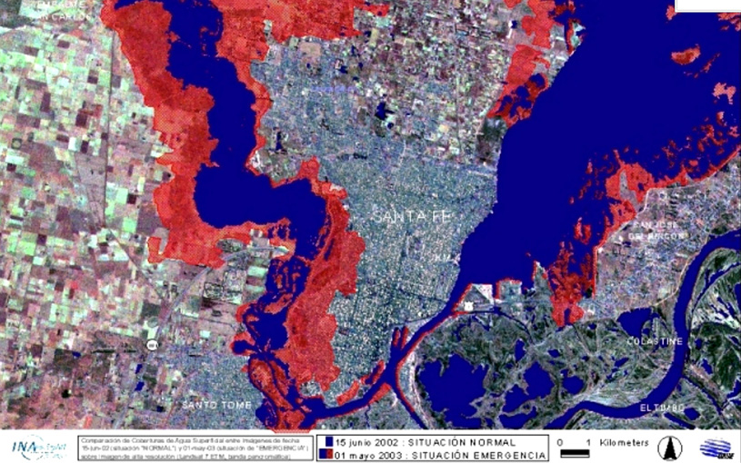Por iniciativa de la Comisión de Actividades Espaciales (CONAE) se generó un proyecto en el International Charter “Space & Major Disasters”, siendo designado el INA como Project Manager del mismo, con la función de solicitar dónde, cuándo y qué tipo de imágenes se requerían para monitorear satelitalmente la emergencia. A través de este convenio internacional entre agencias espaciales se dispuso de imágenes de distintos sensores (ópticos y radares de apertura sintética). La agencia espacial francesa (CNES) cedió cuatro imágenes SPOT (sensor óptico) mientras que la canadiense (CSA) cedió dos imágenes RADARSAT (radar). Ésta fue la primera experiencia en Sudamérica de cooperación internacional para la asistencia en desastres naturales. La imagen SPOT utilizada, de fecha 4 de mayo (resolución de 20 metros) permitió observar el impacto en el casco urbano, visualizándose (luego de clasificar su respuesta espectral) la cobertura de agua en superficie para esa fecha, con una alta resolución. En la imagen siguiente se observa en color azul la clasificación de la cobertura hídrica de fecha 4 de mayo.
