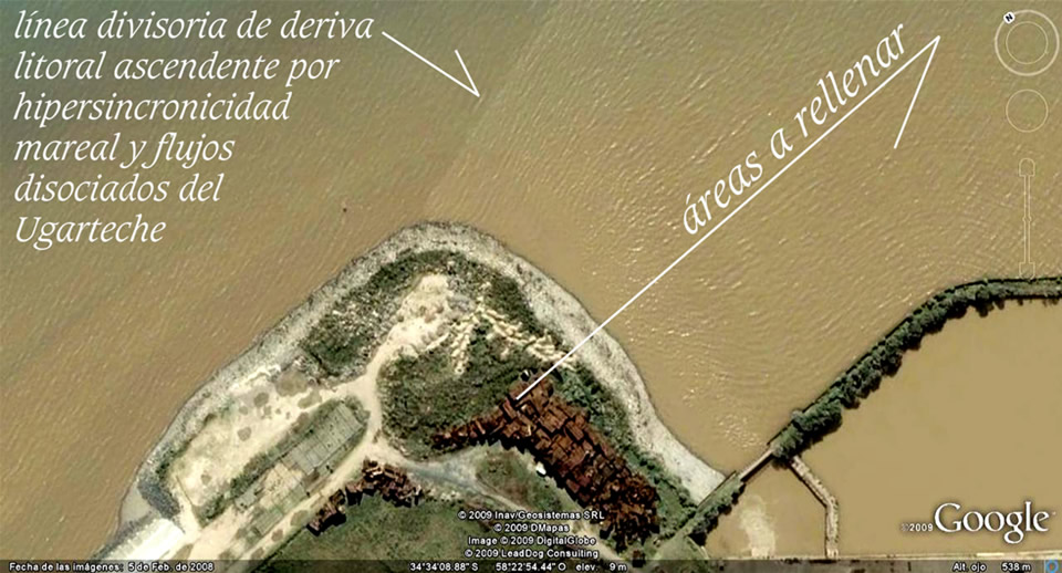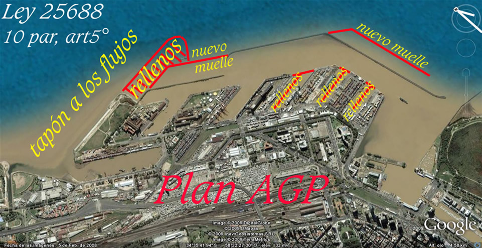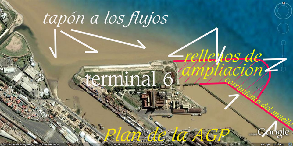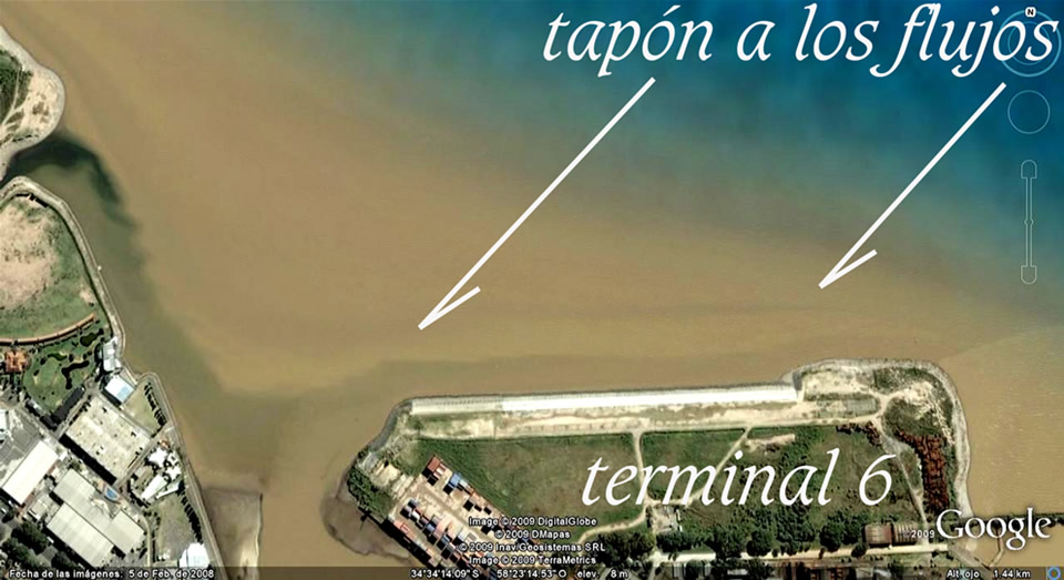 Las imágenes que siguen muestran las propuestas de modificación del puerto y en particular las de esta Terminal 6. En ellas se advierte con claridad el entorpecimiento a los flujos que se suma a las dificultades terminales que ya encuentra el sector de aprox. 80 Km2 al Norte de esta terminal, que queda encerrado entre el Emilio Mitre y la costa. La jurisdicción portuaria hoy cuenta con 290 Has. Perdió 160 has que fueron a parar a los partidos políticos tradicionales. Por ello ahora aparecen propuestas para rellenar dársenas, y así recuperar capacidad de estiba y correr el muelle exterior para ampliar la capacidad de maniobra y atraque. La ciudad avanza; los intereses políticos y privados tejen alianzas; se quedan con 160 Has que bien podrían haber asistido el crecimiento portuario en ellas. Nadie se hace cargo de estas transferencias y a nadie le importa lo que pasa riberas afuera. En ningún momento se plantean la necesidad de acabar con este puerto metido en el corazón de la gran ciudad, comenzando a liquidar los sectores de carga para que de ello se ocupen los nuevos puertos del Paraná con inmensas instalaciones desperdiciadas por las prohibiciones que tienen de operar para no perjudicar a los concesionarios del puerto de Buenos Aires. Por el contrario, reparten la torta y hoy vemos cómo, gravámenes sobre containers van a parar a manos sindicales y áreas nuevas a manos de amigos del poder, incluído un comentarista televisivo al que la vocación parece no alcanzarle. Estos repartos nada advierten sobre el costo de estas decisiones por no incluir mirada alguna a sustentabilidad alguna. Las necesidades del puerto no cesan de crecer y ninguna mirada a los límites naturales aparecen esbozados por autoridad o institución de estudios ambientales. Hace 223 años apareció la primera gran necesidad de mirar los flujos en oportunidad de abrirse la boca falsa del Riachuelo cuyo diagnóstico aún sigue velado. Hace 50 años ya era hora de revisar los daños ya provocados a los flujos ribereños, sus consecuencias en la sustentabilidad de las riberas urbanas, sus vertidos y sus aguas. Tener una letrina en la puerta de casa, con silencios y repartos no alcanza para ser soslayada. Las criminales acreencias costaneras proyectadas por el gobierno de la CABA ya merecieron mis observaciones. En el hipertexto dedicado al concurso del Parque Lineal Norte organizado por el Gobierno de la CABA y la Sociedad Central de Arquitectos volvía tocar este tema de los flujos y riberas haciendo inclusión de un pedido de informe al Subsecretario de Puertos y Vías Navegables, que incluyera su respuesta. A este siguió un resumen de salidas interactuantes"obligadas" exhibiendo sus insistencias en la prensa. Calculan ingresarán anualmente 300.000 contenedores por ferrocarril luego de las reformas de las vías férreas. Esto es alrededor del 20 al 25% de las cargas totales. El resto se mueve con camiones que ingresan al corazón de la gran ciudad. Para resolver estas cuestiones aparecen la hidrovía y los nuevos puertos del Paraná a los que han expresamente prohibido operar containers para no tocar intereses particulares de angurrientos políticos. Uno sólo de ellos, el de Murchison y Brasil Cotia Trading hoy está preparado para mover la mitad de todos los contenedores del país y con inversión adicional en un año lograría atendes todo el movimiento del Puerto de Buenos Aires. Cualquiera de estos puertos dobla las superficies de estacionamiento y estiba del Buenos Aires. Inmediatos a autopistas y enlaces ferroviarios sólo esperan el destape de la olla. Las mareas estuariales asisten las profundidades de los primeros tramos de la hidrovía y por ello las dificultades en bajantes no los afectan en mayor grado que al de Buenos Aires Qué necesidad hay entonces de seguir defendiendo este enredo de ferrocarriles y camiones en semejante lugar; que en adición mucho más importante conlleva todos los desastres que ha venido ocasionando este puerto con respecto a los flujos. Materia a la que nunca miraron. En adición de gravedades, sólo el año pasado llevaron y volcaron en el Km 26 del canal de acceso 3.000.000 m3 de dragados que cada año tienen previstos seguir volcando allí, para terminar de destruir el único cono de flujos que queda sano. No olvidemos que allí también se arrojan 5.000.000 m3 de dragados del Emilio Mitre y allí también preven sacar a relucir las bocas difusoras de los dos emisarios ¡con 4.000.000 m3 de vertidos diarios! ¿Alguien tiene idea de lo que nos espera con las veladuras de este lodazal ribereño que aún imaginamos parte de un portentoso estuario? Ninguna sustentabilidad tiene este puerto; y mucho menos, cualquiera de estas propuestas